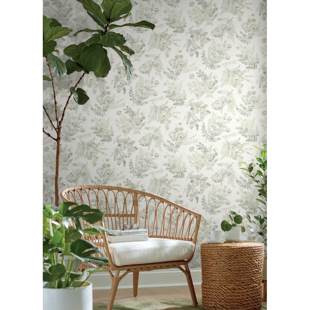 Simple, wild bouquets of feathery flowers and ferns bring a hint of romance to interiors. Featured here in a earthen palette of golden brown, beige, and rich greens against cream. Frith is a prepasted, surestrip wallpaper measuring 20.5 inches wide by 33 feet long, covering approximately 56.4 square feet per roll.