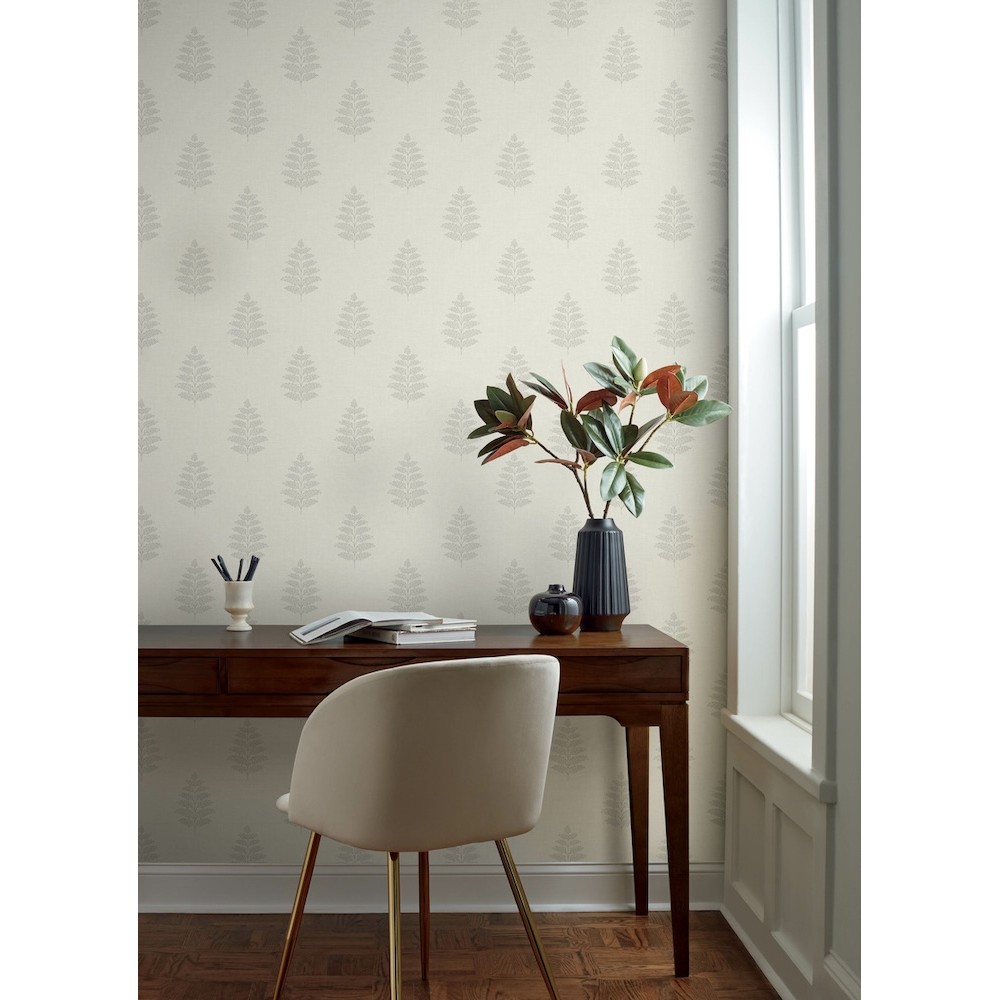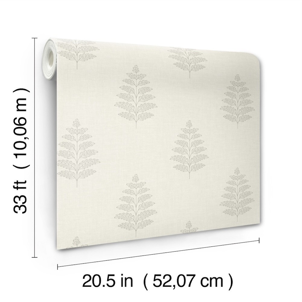 Delicate grey outlines of ferns etched along a cream, linen-detailed backdrop offer simple yet rich woodland elegance. Frond is a prepasted, surestrip wallpaper measuring 20.5 inches wide by 33 feet long, covering approximately 56.4 square feet per roll.