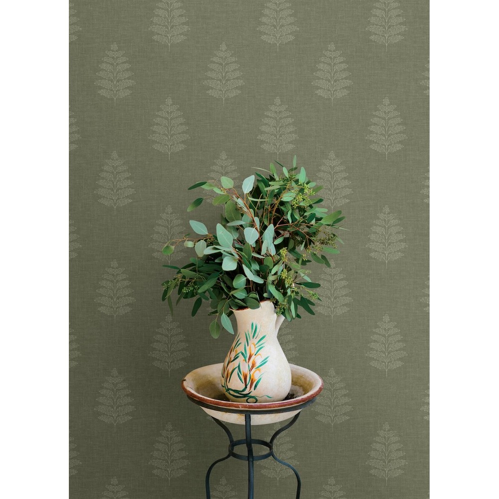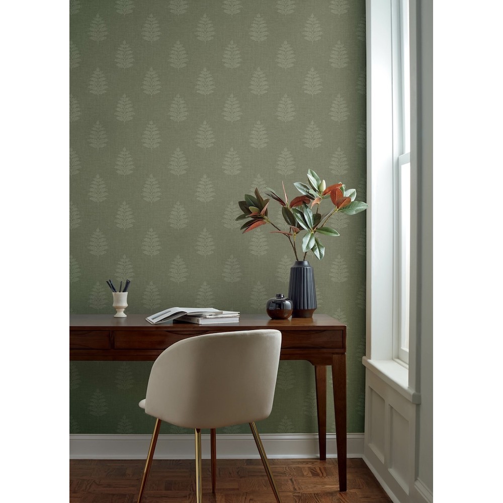 Delicate pale green outlines of ferns etched along a evergreen, linen-detailed backdrop offer simple yet rich woodland elegance. Frond is a prepasted, surestrip wallpaper measuring 20.5 inches wide by 33 feet long, covering approximately 56.4 square feet per roll.
