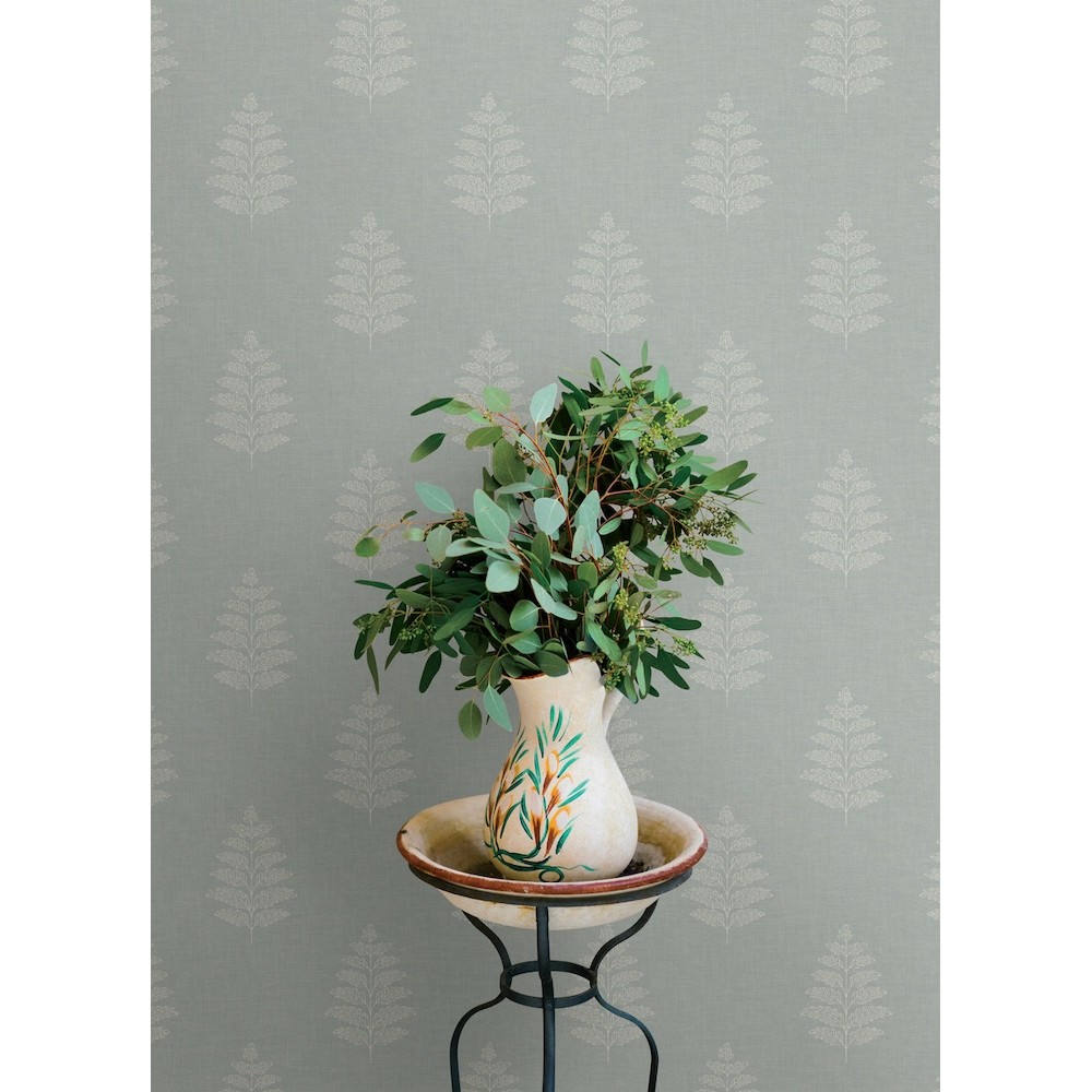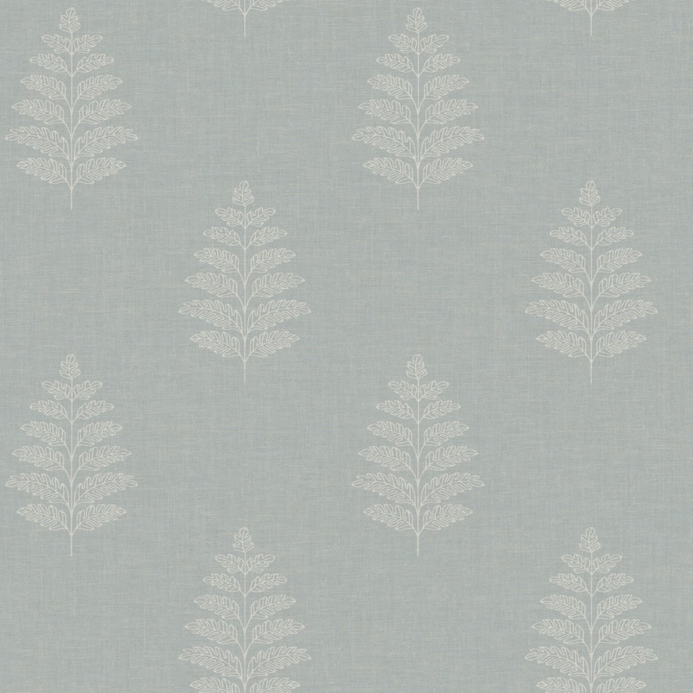 Delicate white outlines of ferns etched along a pale robin's egg, linen-detailed backdrop offer simple yet rich woodland elegance. Frond is a prepasted, surestrip wallpaper measuring 20.5 inches wide by 33 feet long, covering approximately 56.4 square feet per roll.