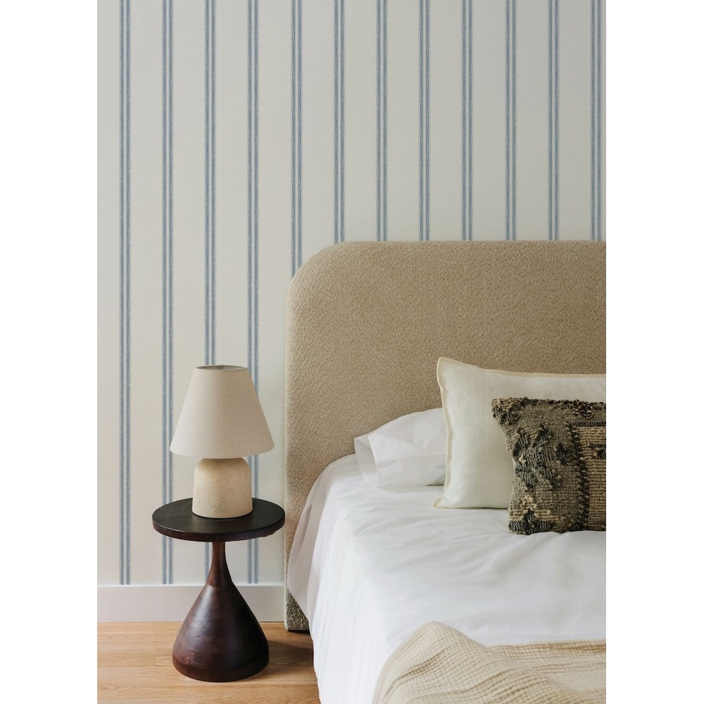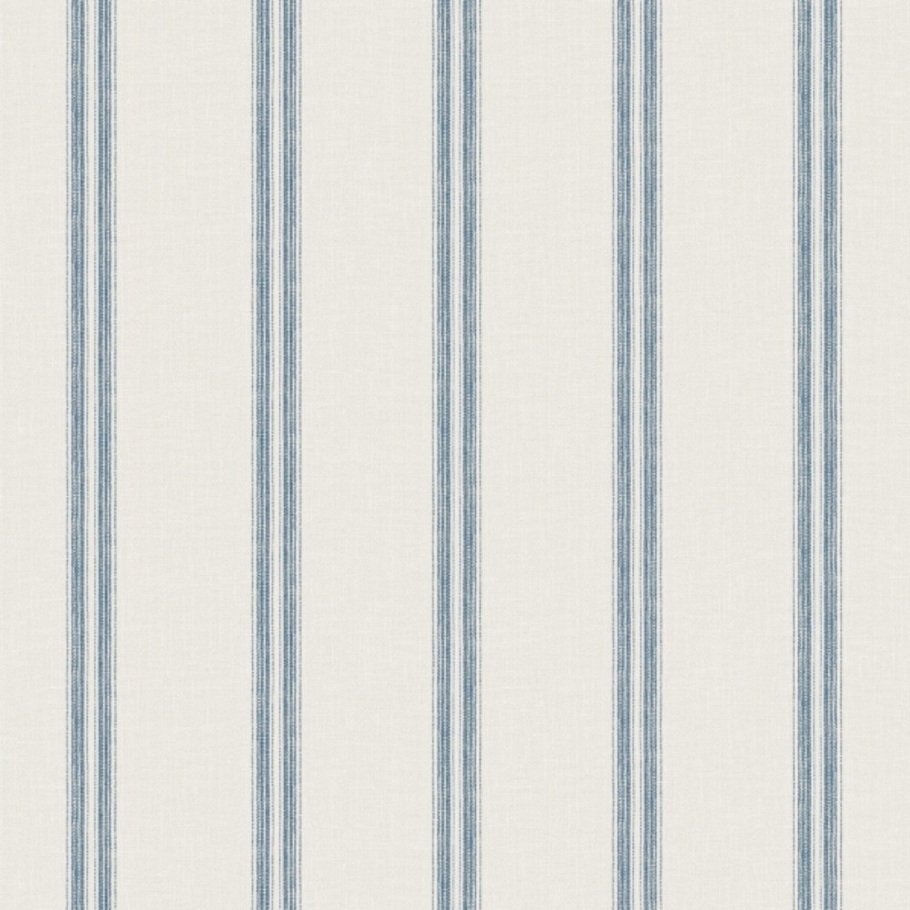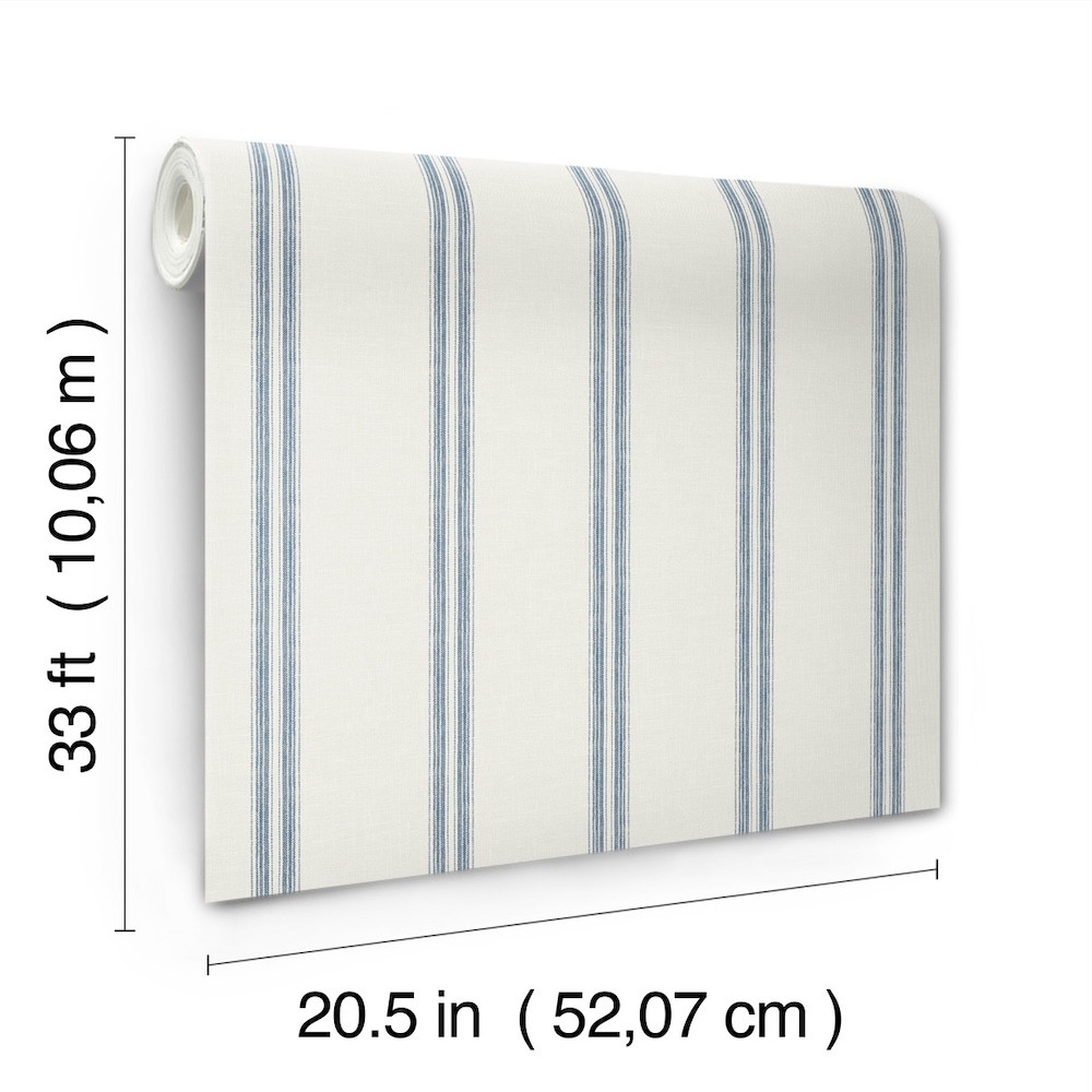 Thin, blue bands evenly spaced along a white backdrop infused with linen detailing offer simple, timeless comfort. Johnny is a prepasted, non woven blend wallpaper measuring 20.5 inches wide by 33 feet long, covering approximately 56.4 square feet per roll.