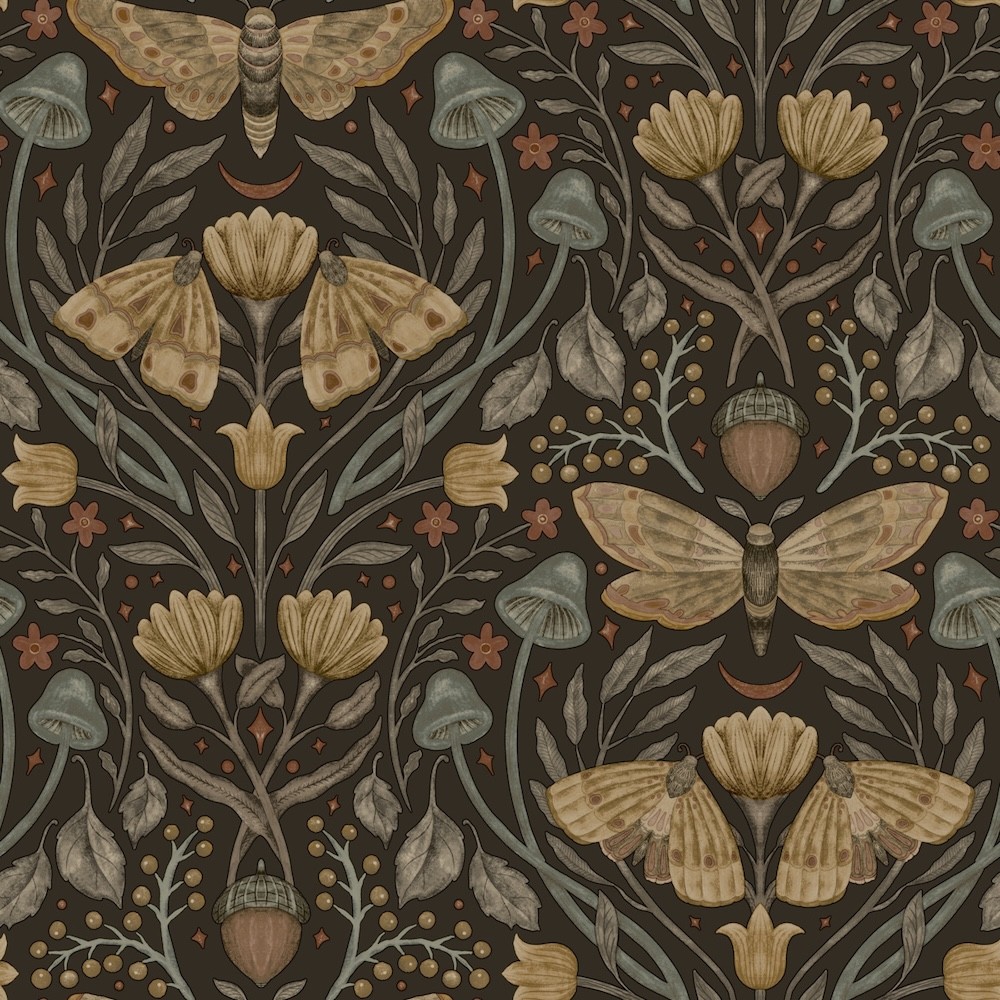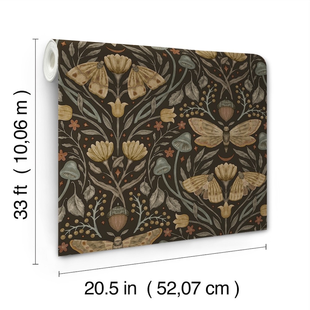 Bring enchantment to your home with this magical woodland damask featuring velveteen moths framed by twining leaves, mushrooms, wildflowers, berries, and acorns. Featured here in a moody palette of ochre, turquoise, taupe, terracotta, and grey against matte black. Mystic Moth is a prepasted, surestrip wallpaper measuring 20.5 inches wide by 33 feet long, covering approximately 56.4 square feet per roll.