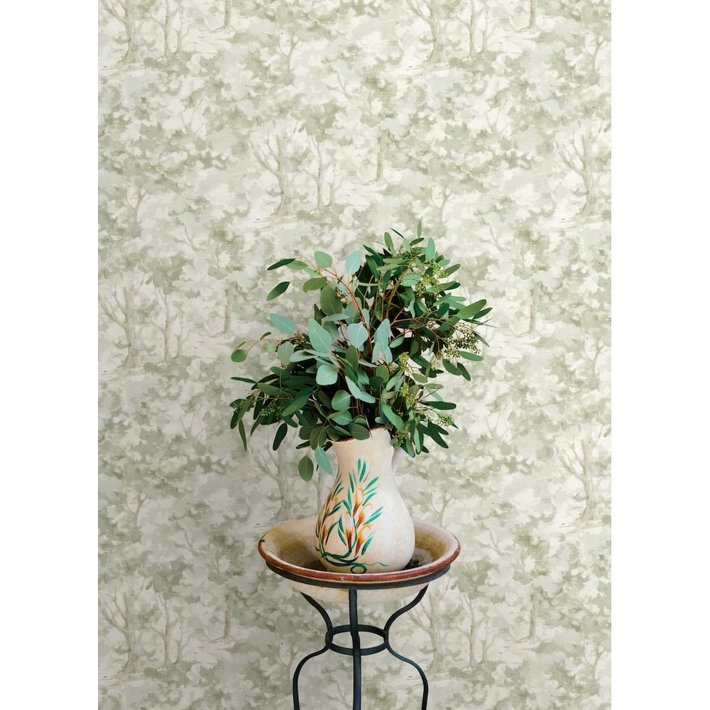 This stylized forest wallpaper highlights the dense, cloud-like foliage of ancient oak trees. Seen here in a palette of soft greens, pale blue, beige, and cream. Thicket is a prepasted, surestrip wallpaper measuring 20.5 inches wide by 33 feet long, covering approximately 56.4 square feet per roll.