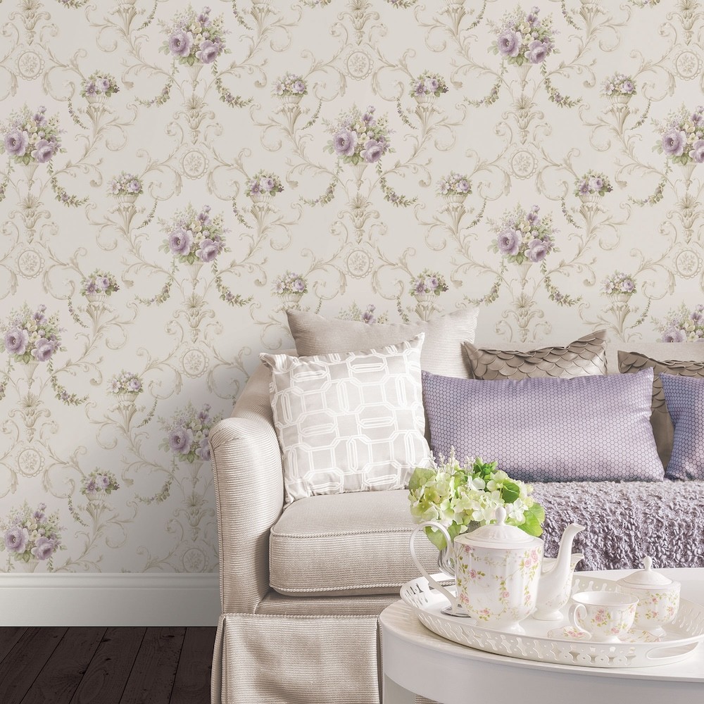 Lush large scale floral bouquets adds elegance and style to any room in your home. The flowers are surrounded by scrolling leaves and a cameo letting the viewer focus on the main design. Elegance, beauty and design wrapped in this gorgeous design.