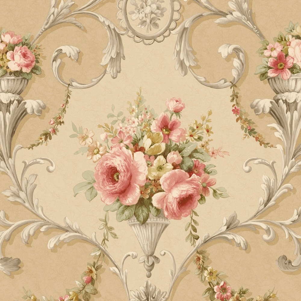 Lush large scale floral bouquets adds elegance and style to any room in your home. The flowers are surrounded by scrolling leaves and a cameo letting the viewer focus on the main design. Elegance, beauty and design wrapped in this gorgeous design.