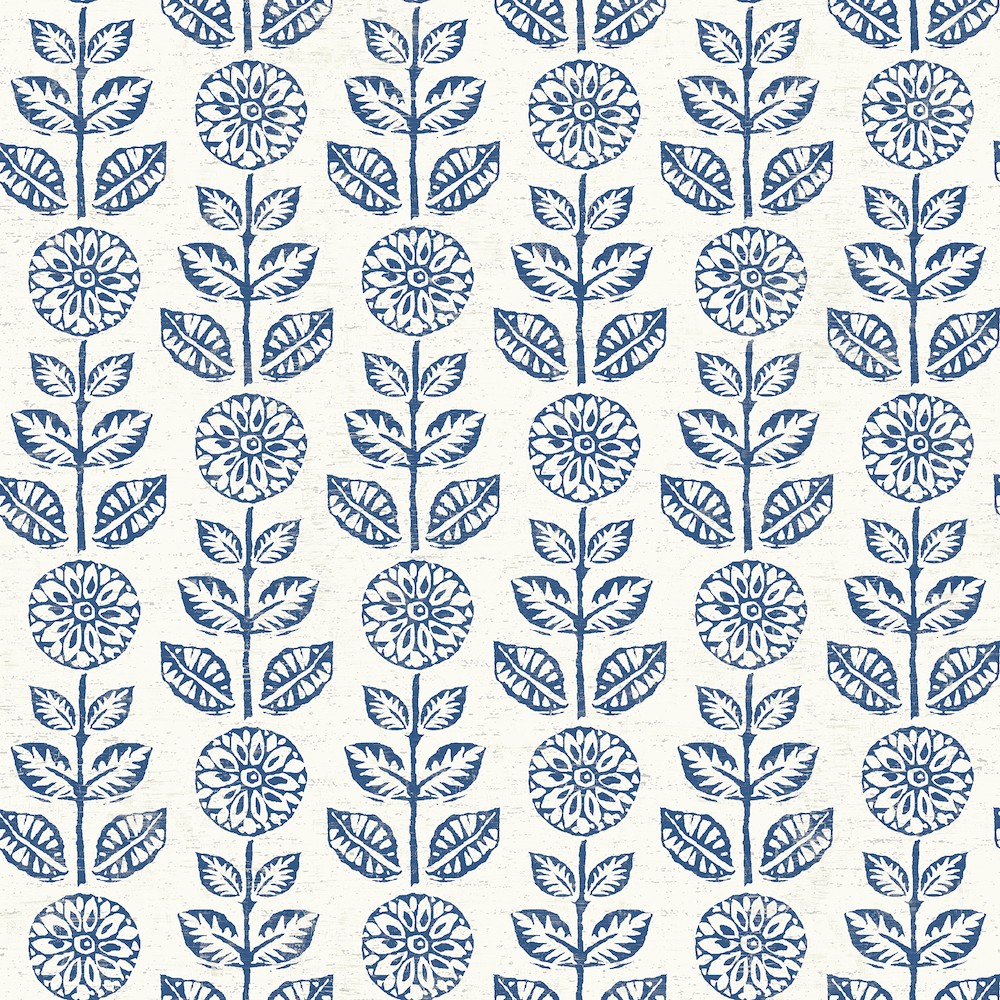 This folksy floral is a surefire way to bring charm to your home! The dark blue dahlias seem to be block-printed in proud columns against a distressed white backdrop. Dolly is a prepasted, non woven wallpaper.