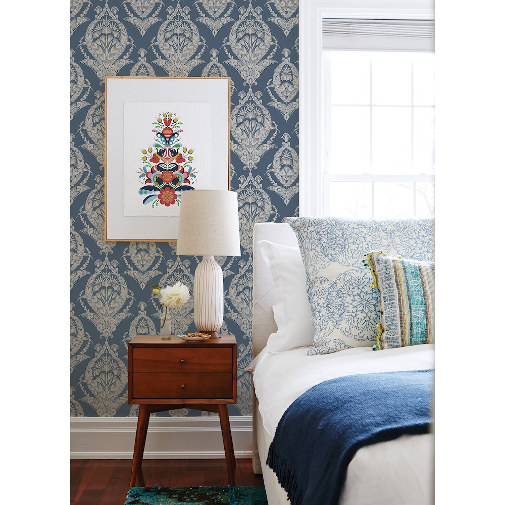 This gorgeous damask wallpaper brings stately elegance to your interiors. Two alternating medallions, both large in scale, are formed from a beautiful assortment of botanicals inked in a blend of white and light grey against rich indigo. Arlie is an unpasted, non woven wallpaper.