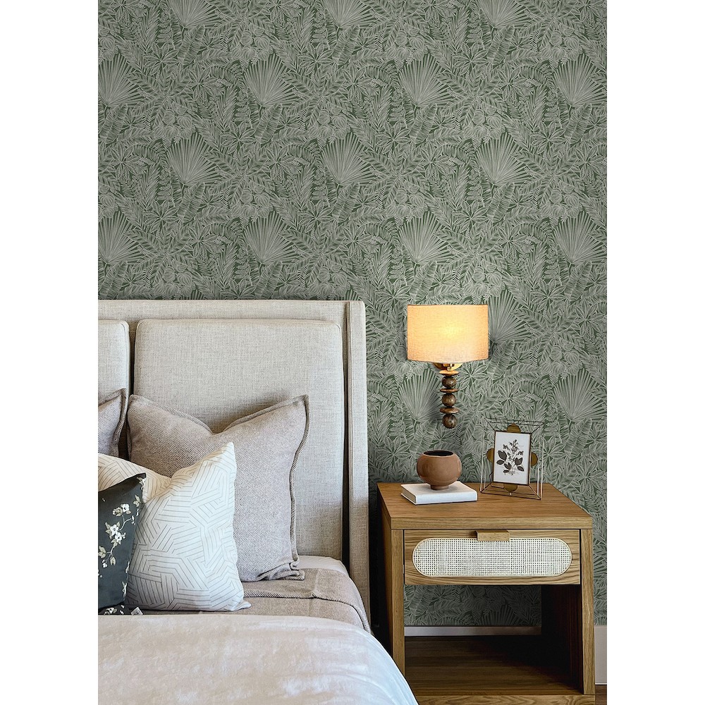 Create a sophisticated retreat with this gorgeous botanical design. The lush foliage is intricately detailed in pale grey ink against a deep green faux linen backdrop. Vita is an unpasted, non woven wallpaper.
