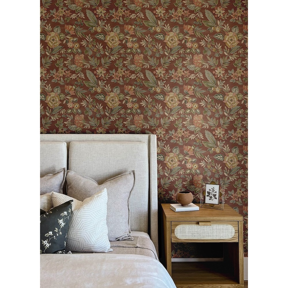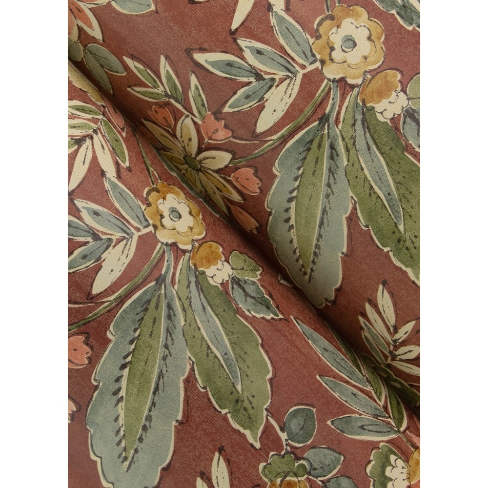 Twining vines are bedecked in voluminous floral blooms and delicate fruits, with free-flowing watercolors adding to the design's elegant charms. Rich and earthy greens, teals, ochres, and salmon are warmly offset by a russet background. Begonia is an unpasted, non woven wallpaper measuring 20.5 inches wide by 33 feet long, covering approximately 56.4 square feet per roll.