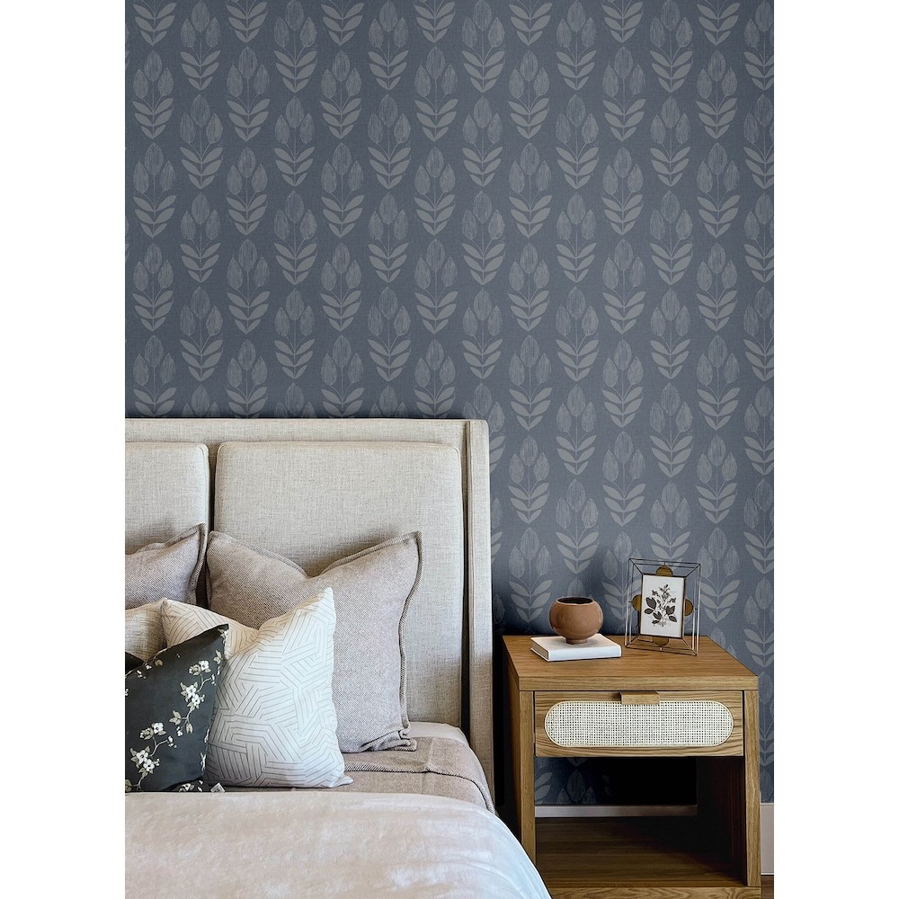 Earthen elegance at its finest, this botanical print features stylized light grey tulips printed along a blue backdrop imbued with woven linen detailing. Garland is an unpasted, non woven wallpaper measuring 20.5 inches wide by 33 feet long, covering approximately 56.4 square feet per roll.