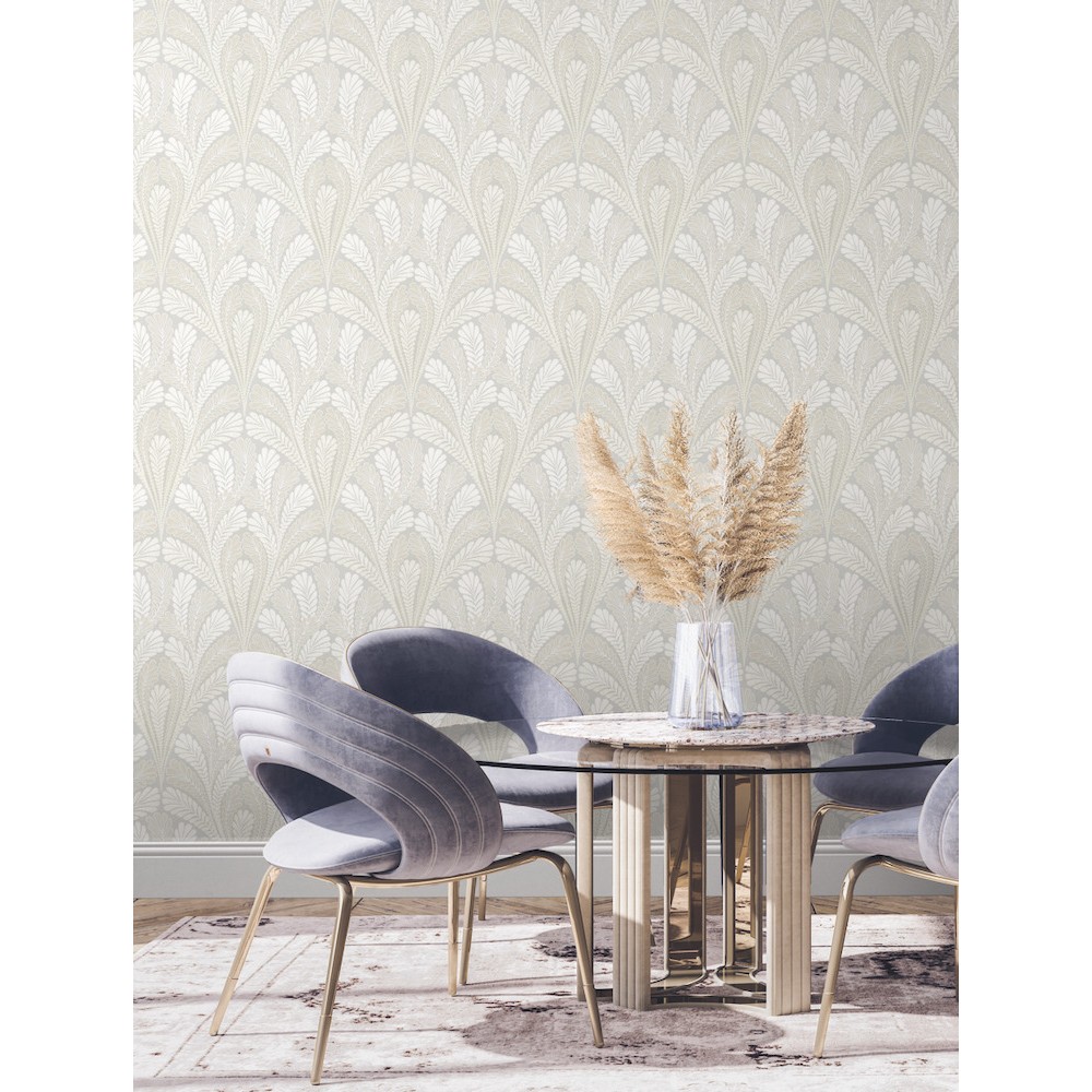Fan shaped feathery pinnate leaves define the graceful arch of pattern Shell Damask, accented by the addition of modern metallic and pearlescence.