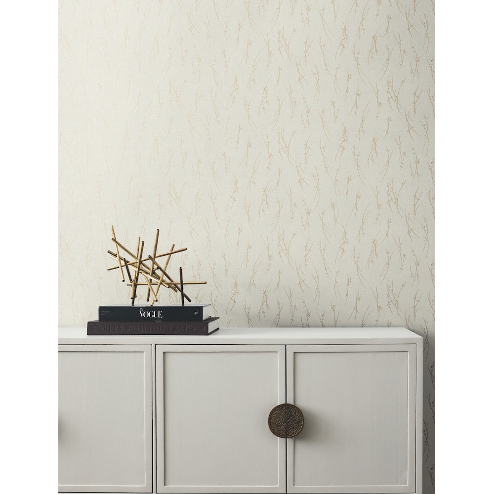A lively toss of small stems with leaves provides a happy feeling to gentle, open pattern Sprigs, shown in light gray and gold metallic. This Sprigs Wallpaper measures approximately 27 inches wide by 26.9 feet long, measuring approximately 60.5 square feet per roll. The long awaited follow-up to the popular first release, Modern Metals Second Edition energizes contemporary spaces with charismatic visual artistry defined by the allure of luminous metallic.
