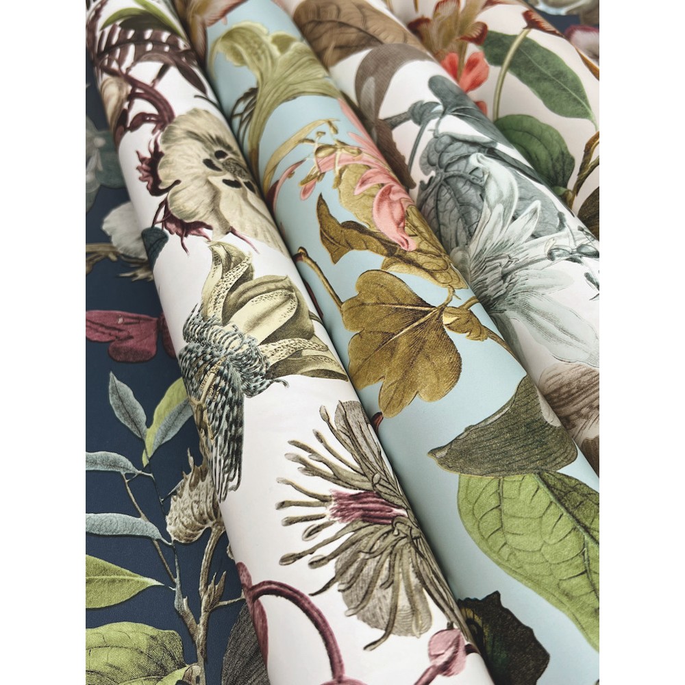A garden of exotic blooms is visited by drifting butterflies in pattern Butterfly House featuring a color palette with green and pink with on a navy background. This Butterfly House Wallpaper measures approximately 27 inches wide by 27 feet long, measuring approximately 60.8 square feet per roll. Florals speak the language of ever-evolving style with instant connection and iconic form that confidently compliments any space and every design signature.