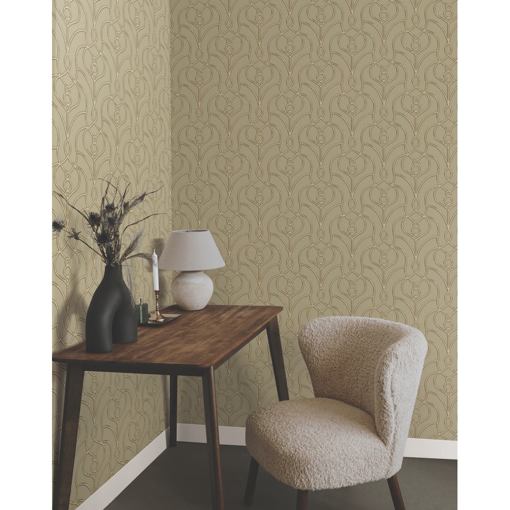 Inspired by a torc necklace, the sinuous golden strands of Divine Trellis gain an additional sense of jeweled affluence with a golden taupe backdrop. This Divine Trellis Wallpaper measures approximately 27 inches wide by 27 feet long, measuring approximately 60.8 square feet per roll. Organic simplicity and lustrous adornment for the modern home.