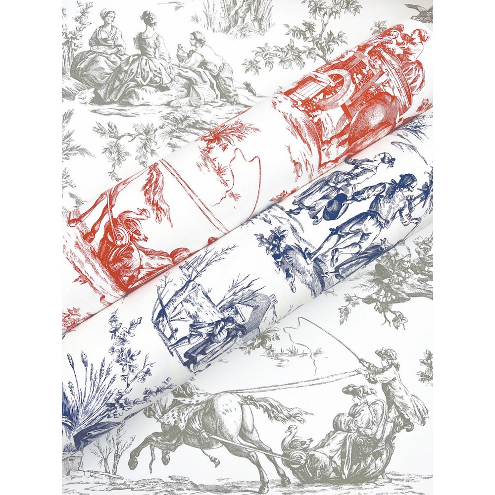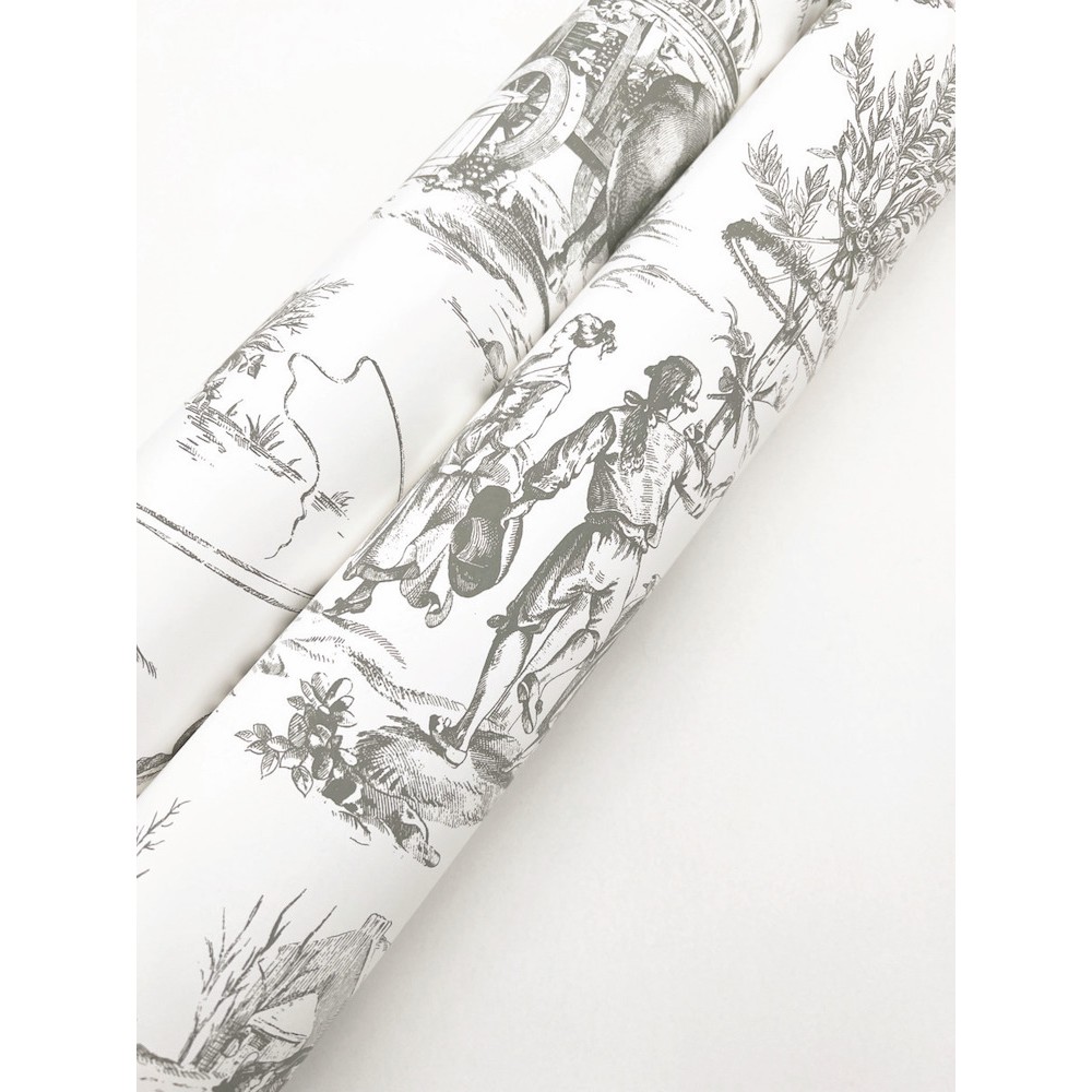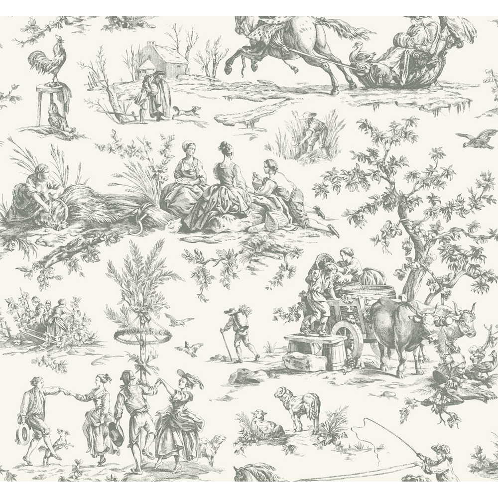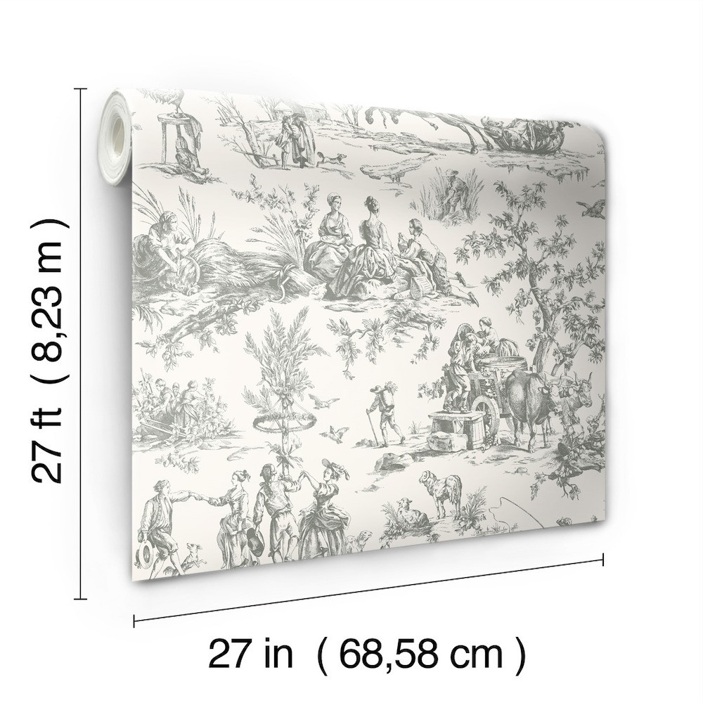 The labors and revelries of Seasons Toile are intricately illustrated in silver-grey against white. This Seasons Toile Wallpaper measures approximately 27 inches wide by 27 feet long, measuring approximately 60.8 square feet per roll. The quintessential design for timeless romance, toile (pronounced ‘twall’) traces its origins to 18th century fabrics.