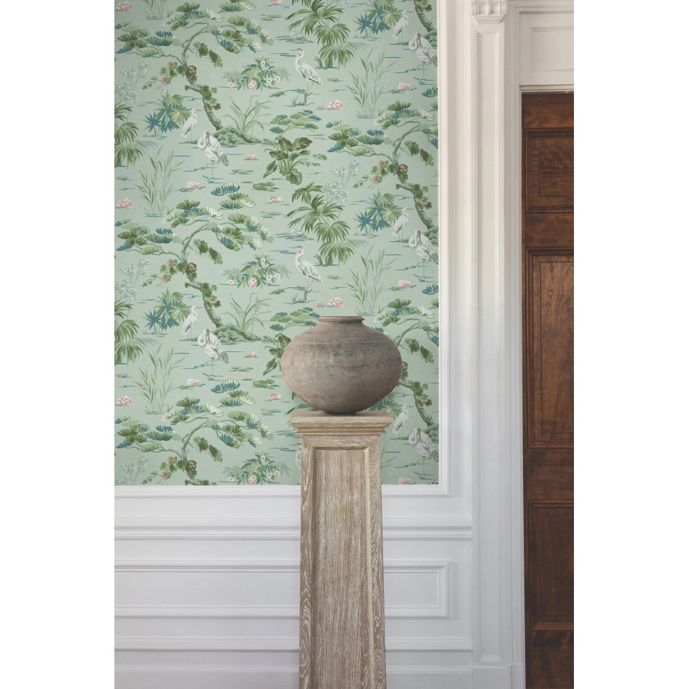 Herons and cranes rest between the lotus blossoms and Matsu trees in Bridgewater's stylized rendering of Asian wetlands, shown here in mint green with blue and pink.