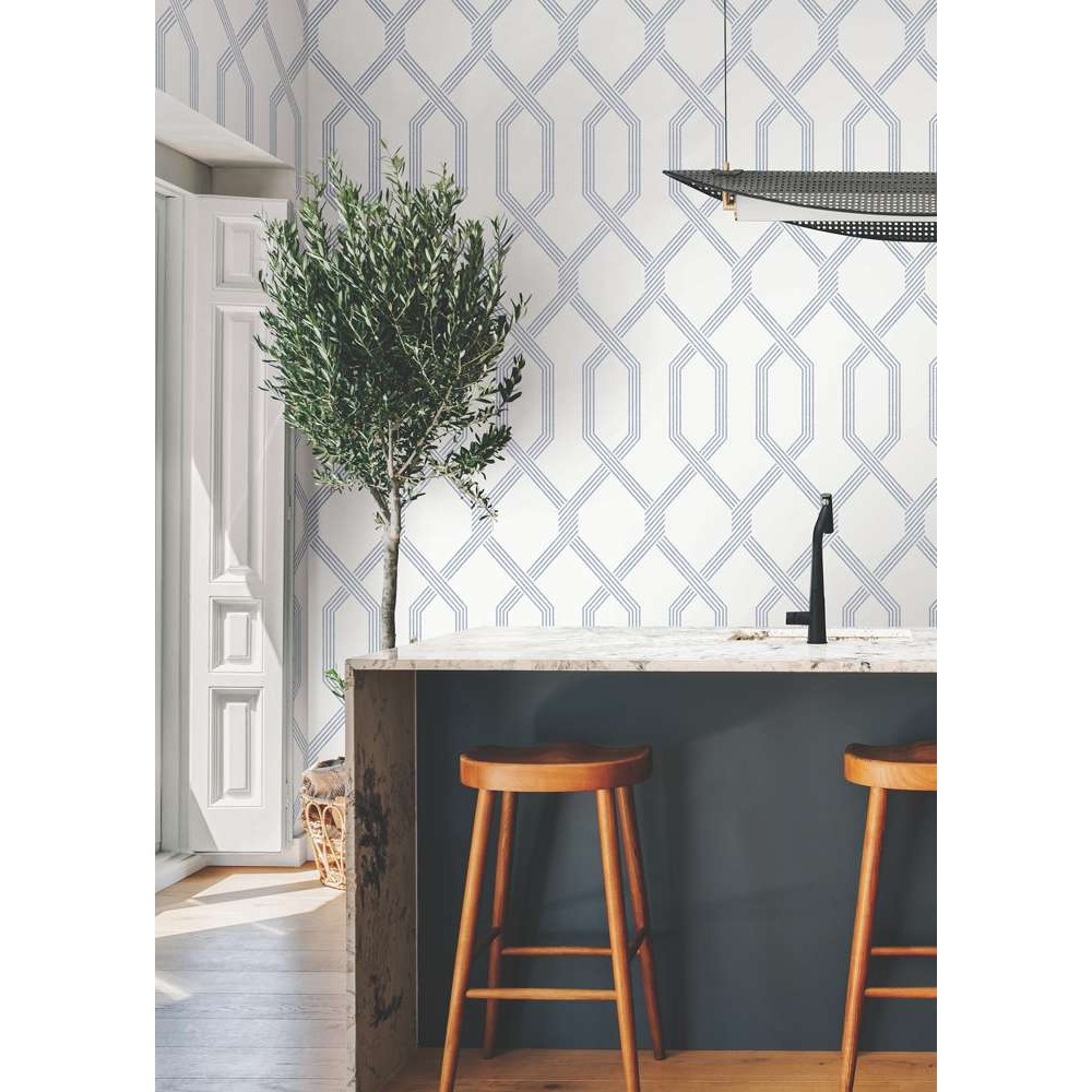 Oversized diamonds within Palisade form as the geometric crossing of lines twist into a ribbon of angled stripes, shown in indigo blue on white.