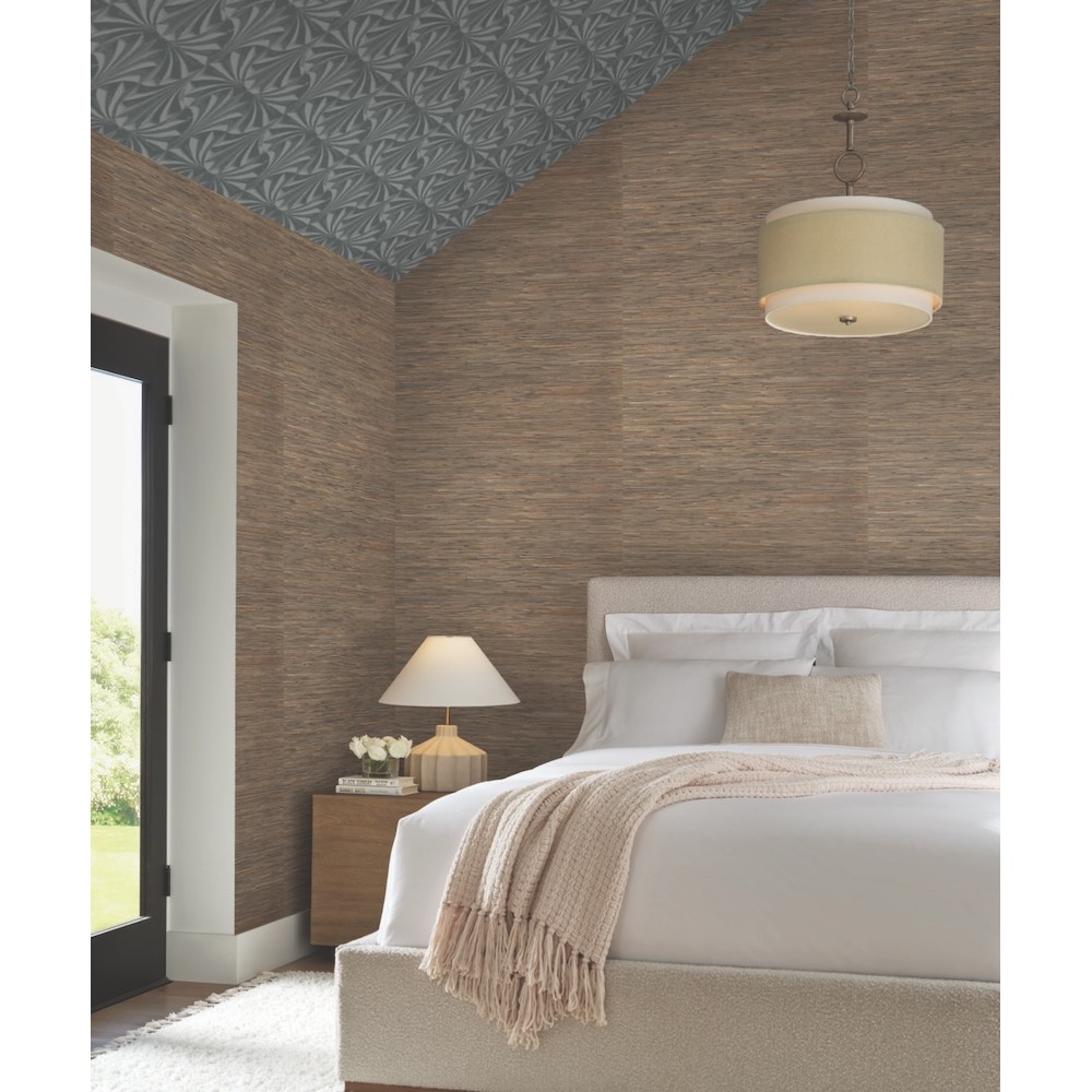 Authentic, wash-coated horizontal strips of bamboo and hemp are applied over a base of metallic foil and high gloss to create touches of shimmer in pattern Bamboo Hemp Blend, shown in natural brown and beige on a gloss black ground. This Bamboo Hemp Blend Wallpaper measures approximately 36 inches wide by 24 feet long, measuring approximately 72 square feet per roll. Finding beauty in this extraordinary organic world.