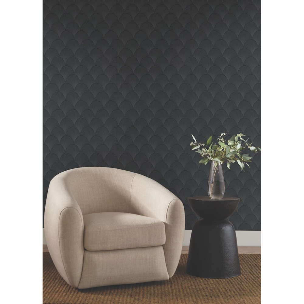 The half-moon overlapping fans of the pattern Metallic Scallop create a field of color, accented with thin lines of raised liquid shimmer to emphasize its beautiful organic curves, shown in black obsidian with with silver. This Metallic Scallop Wallpaper measures approximately 27 inches wide by 27 feet long, measuring approximately 60.8 square feet per roll. Finding beauty in this extraordinary organic world.