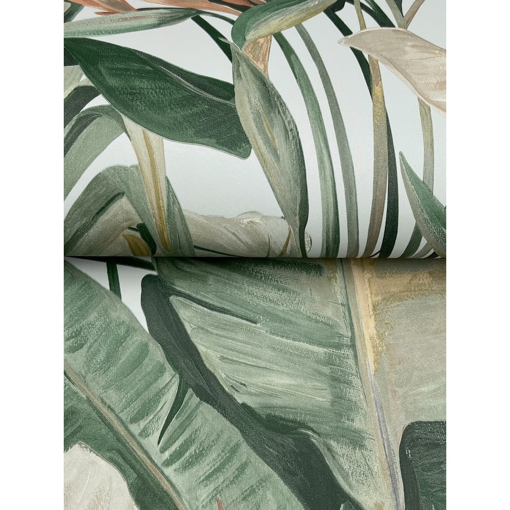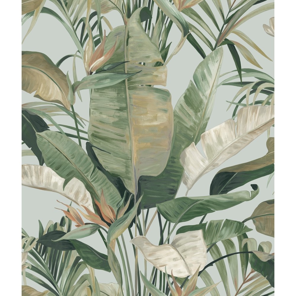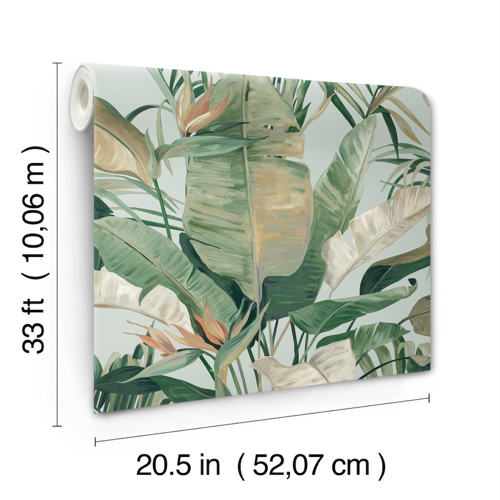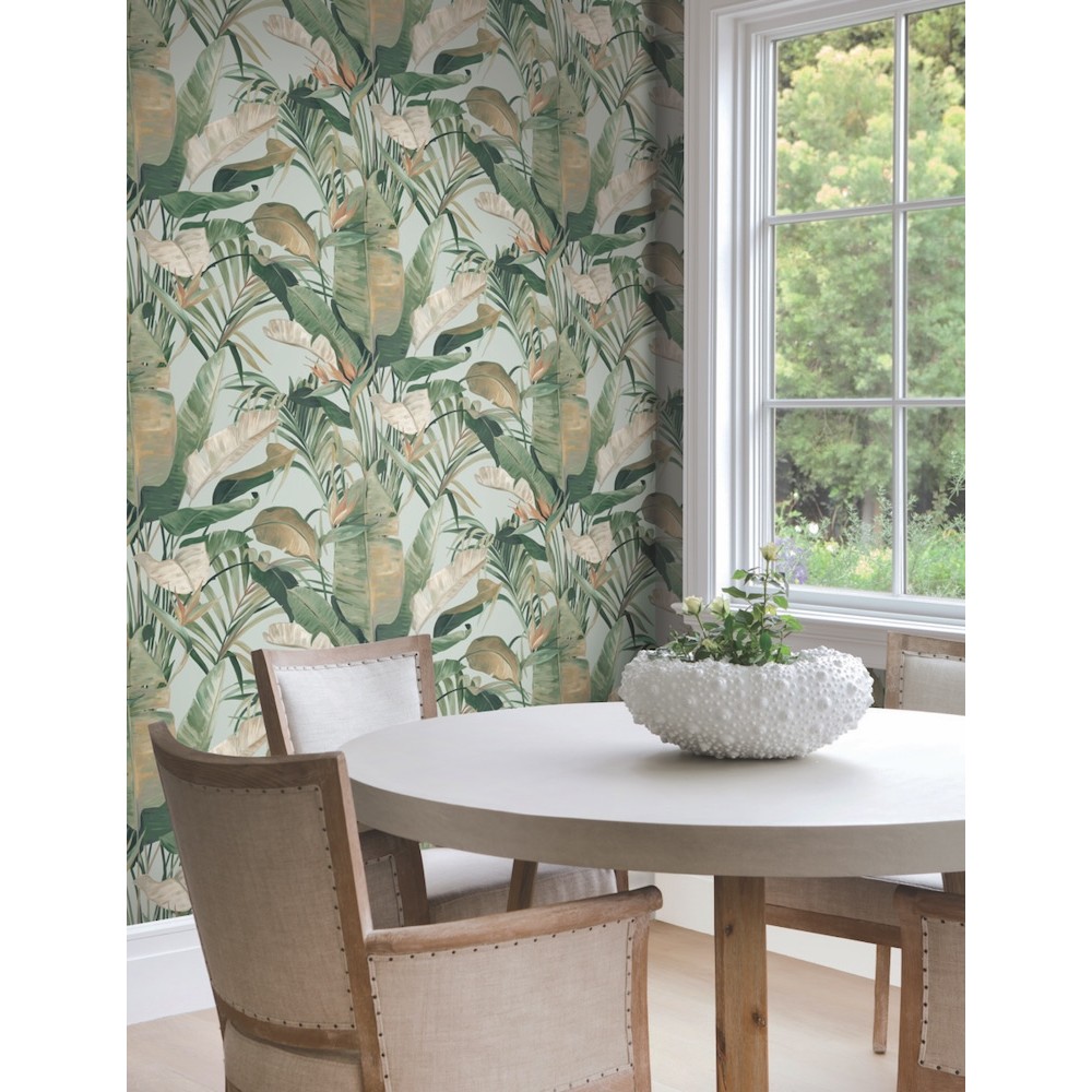 Painterly banana leaf palms and open-air gazebos set the stage for the colorful luxury resort feel of pattern Tropical Cabana, shown in rainforest green with rust and mustard yellow on a pastel blue ground. This Tropical Cabana Wallpaper measures approximately 20.5 inches wide by 33 feet long, measuring approximately 56.4 square feet per roll. Finding beauty in this extraordinary organic world.
