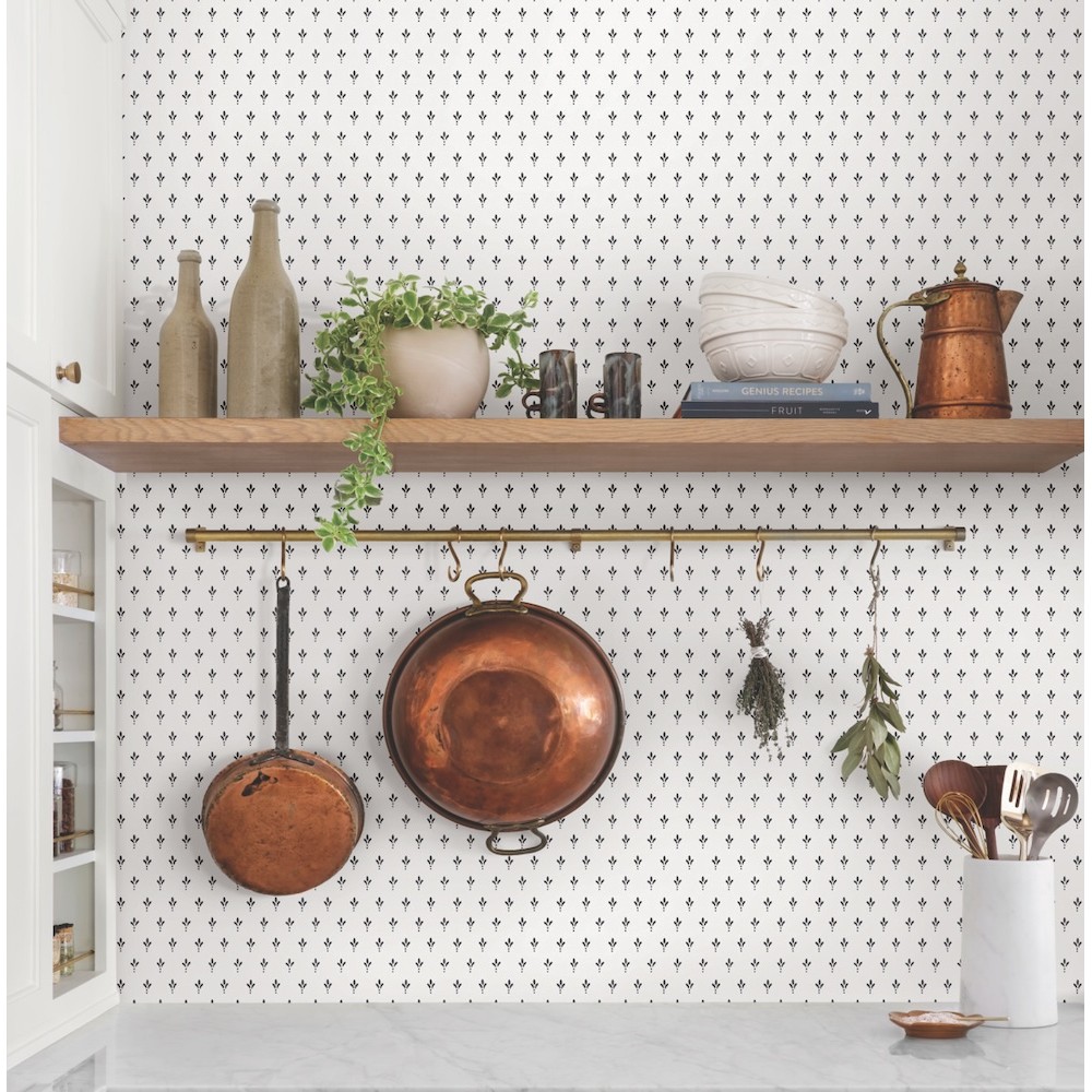 Delicate embellishment meets timeless appeal in this petite, three-leaved stamp pattern inked in black along a cream backdrop. This Charm Wallpaper measures approximately 20.5 inches wide by 33 feet long, measuring approximately 56.4 square feet per roll.