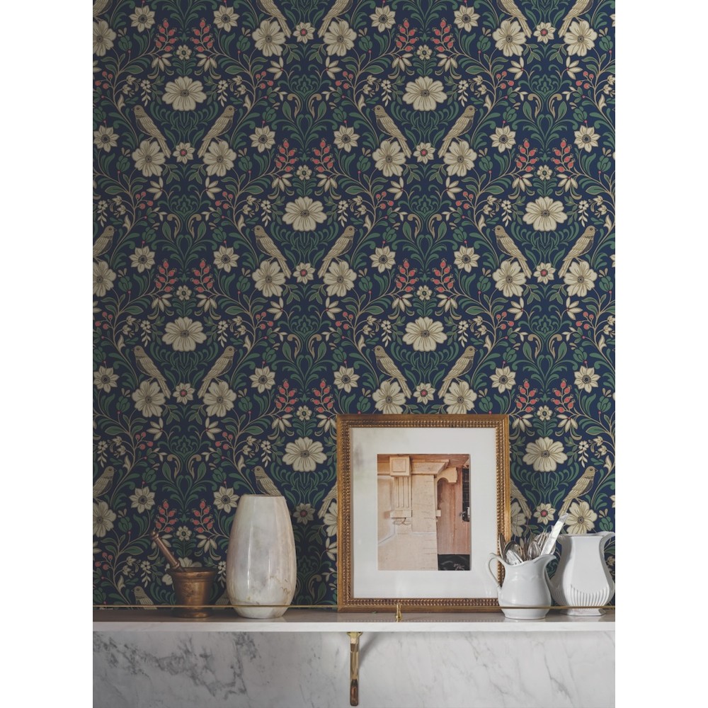 Sparrows perch on flourishing blooms amid rich vines and ripe berries in this delightful woodland damask wallpaper. Featuring beige, golden taupe, green, and berry pink detailing against a navy backdrop. This Colette Wallpaper measures approximately 20.5 inches wide by 33 feet long, measuring approximately 56.4 square feet per roll.