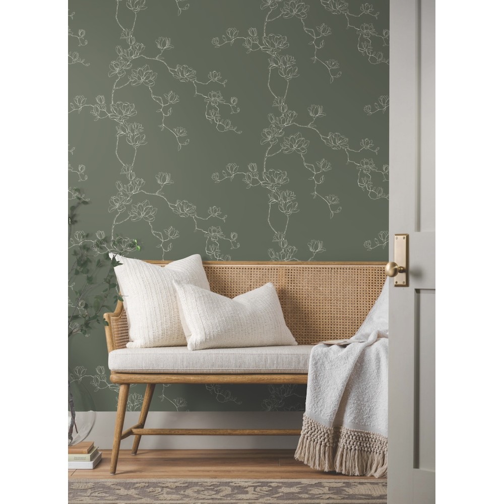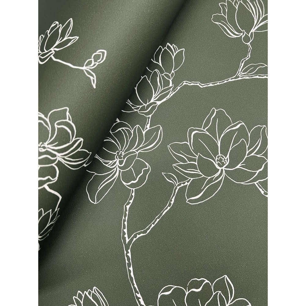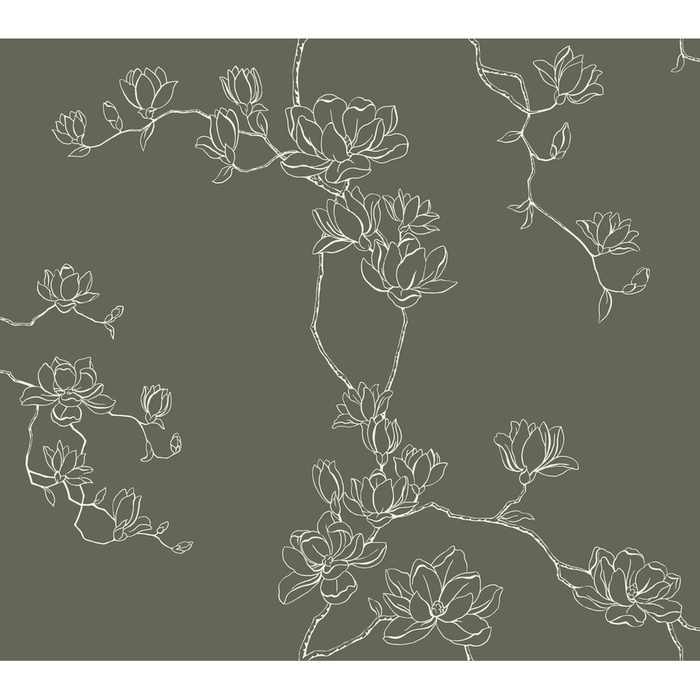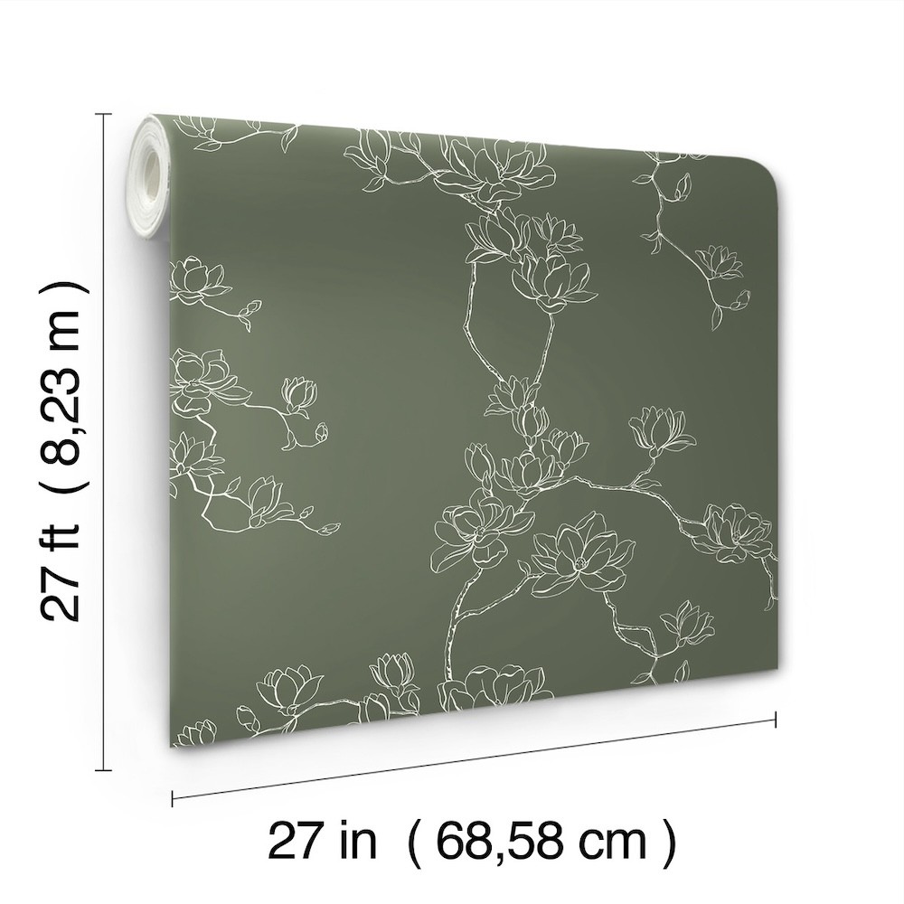 Delicate branches laden with lush magnolia blooms are outlined in white against evergreen to showcase the bloom’s light, simple beauty. This Magnolia Branches Wallpaper measures approximately 27 inches wide by 27 feet long, measuring approximately 60.8 square feet per roll.