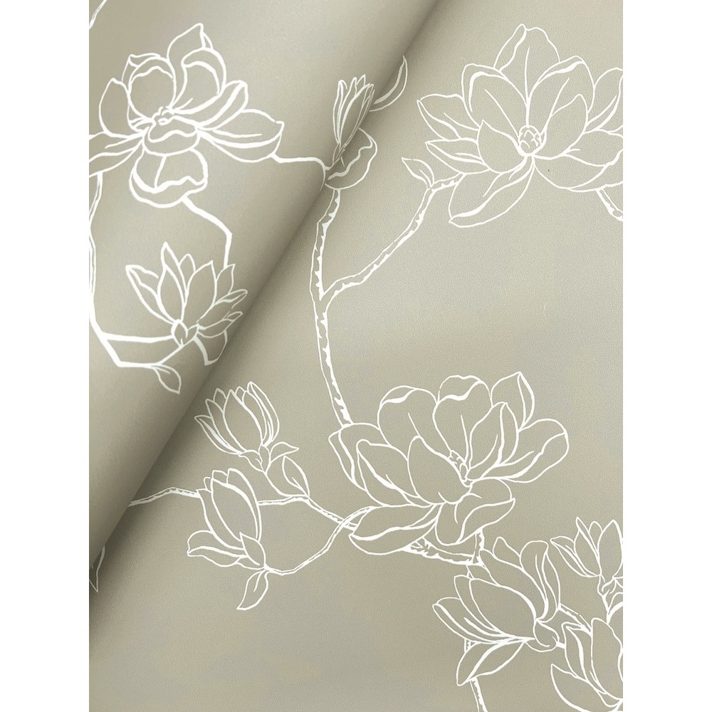 Delicate branches laden with lush magnolia blooms are outlined in white against taupe to showcase the bloom’s light, simple beauty. This Magnolia Branches Wallpaper measures approximately 27 inches wide by 27 feet long, measuring approximately 60.8 square feet per roll.