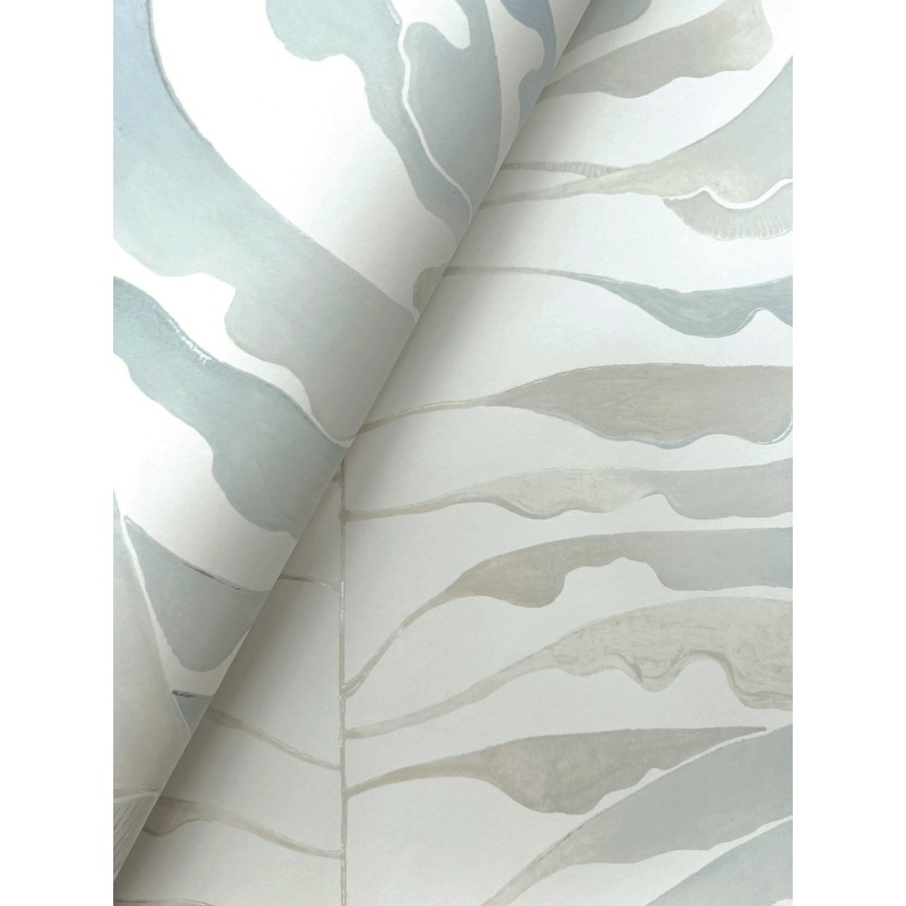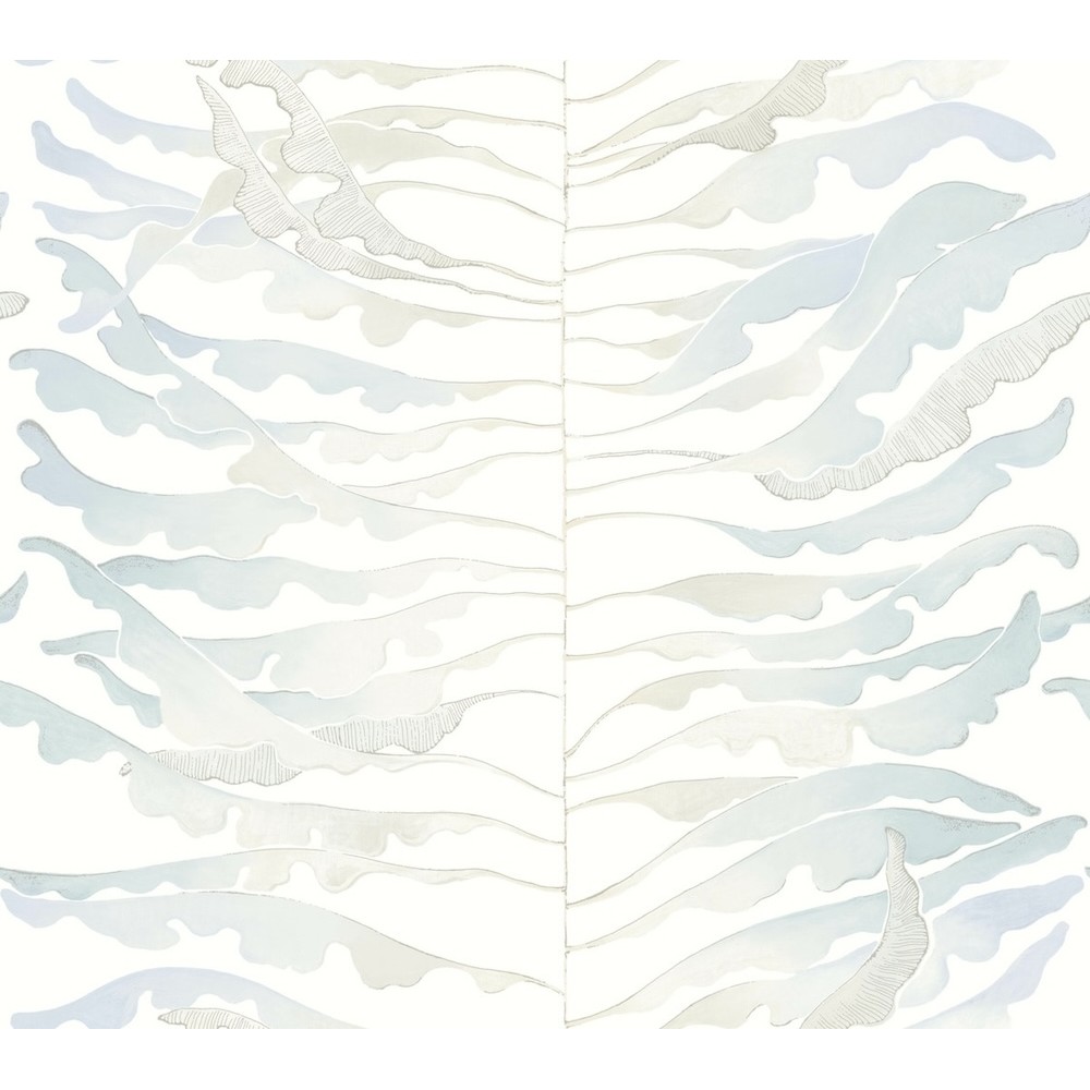 An organic take on striped accents, Leaf Column's illustrative design features thin, curling fronds watercolored in shades of pale blue and delicate grey along a central connective stem embellished with silver highlights. This Leaf Column Wallpaper measures approximately 27 inches wide by 27 feet long, measuring approximately 60.8 square feet per roll. Textural, organic forms grounded in earthly inspiration.