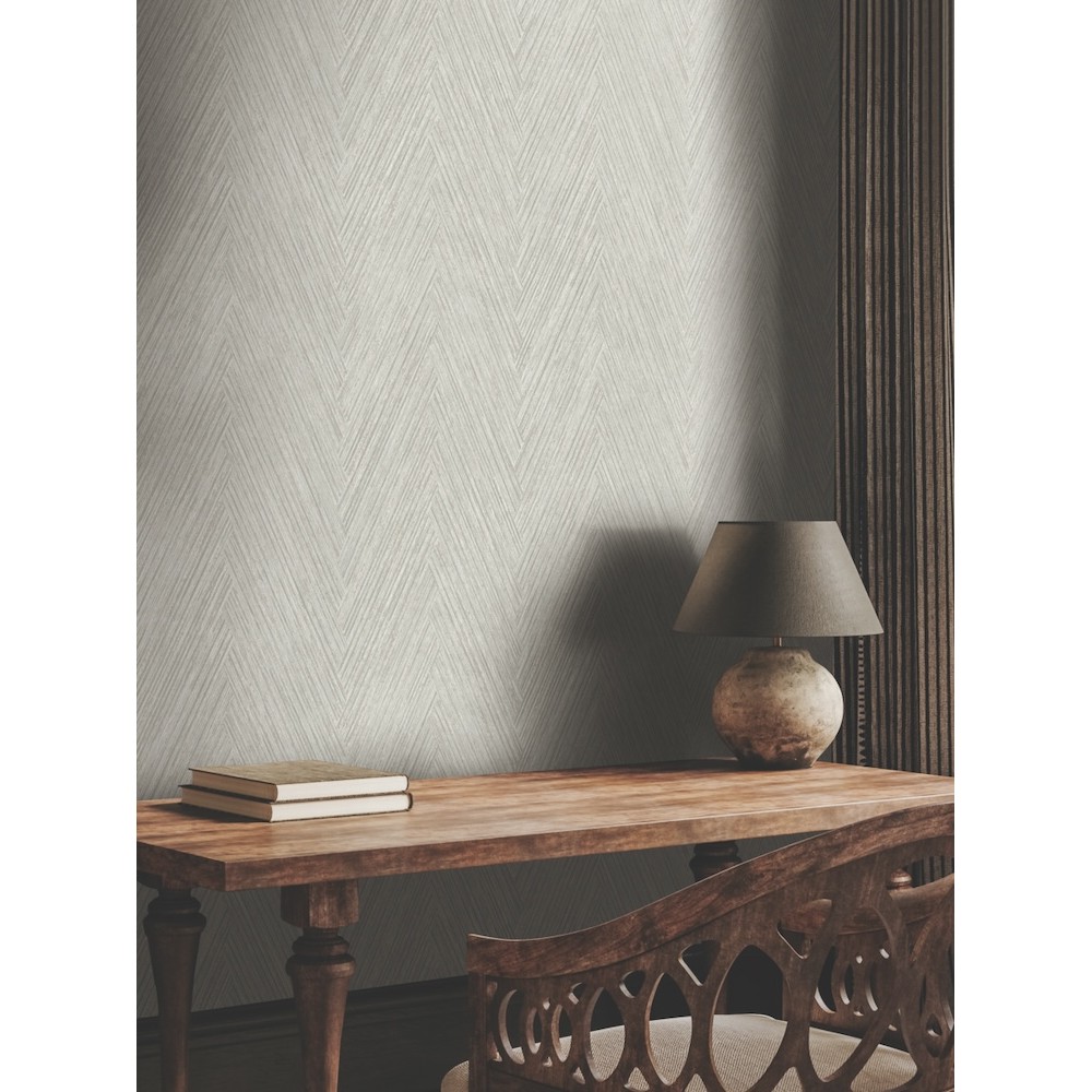 Thatched Herringbone adds extra embellishment to this classic, interlaced pattern with brushes of metallics and woven detailing inked in grey and white. This Thatched Chevron Wallpaper measures approximately 27 inches wide by 27 feet long, measuring approximately 60.8 square feet per roll. Textural, organic forms grounded in earthly inspiration.