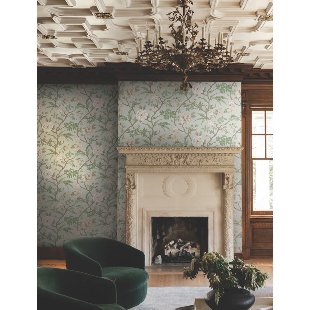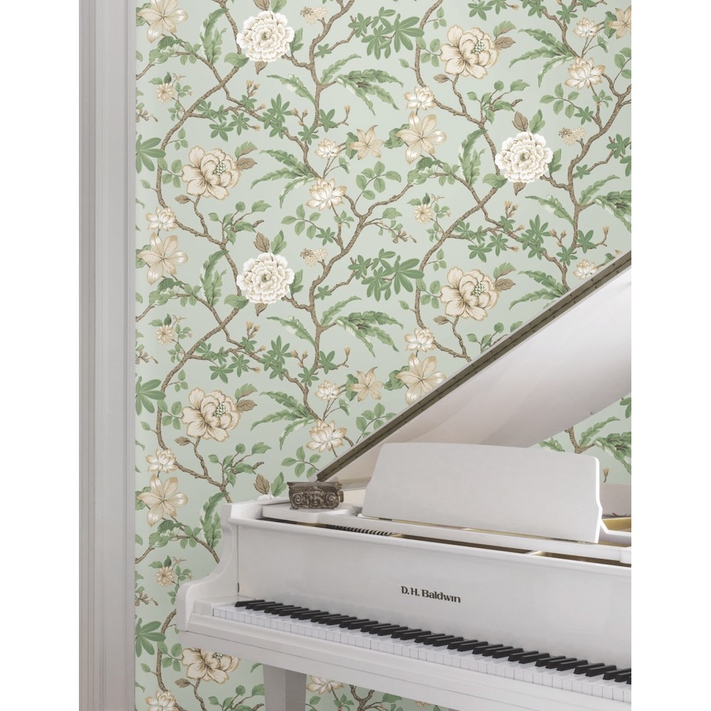 Twisting branches sport a diverse array of lush leaves and voluminous blooms in stately Courtyard Botanical. Featured here in a palette of golden taupe, cream, sage, moss, powder blue, beige, and brown. This Courtyard Botanical Wallpaper measures approximately 27 inches wide by 27 feet long, measuring approximately 60.8 square feet per roll.Â