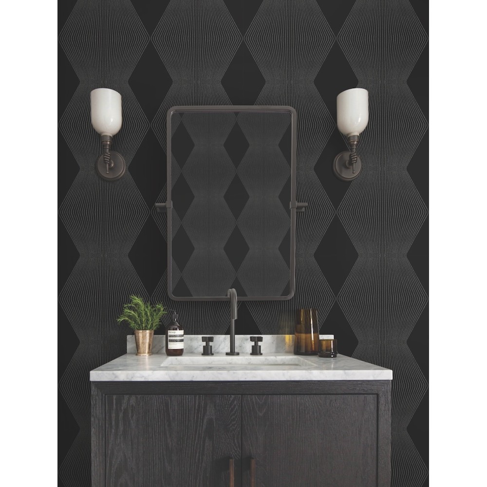Diamond Legacy's dramatic geometric columns garner added depth from tactile, raised ink detailing. Featured here inked in beige and taupe against an ebony ground. This Diamond Legacy Wallpaper measures approximately 27 inches wide by 27 feet long, measuring approximately 60.8 square feet per roll.