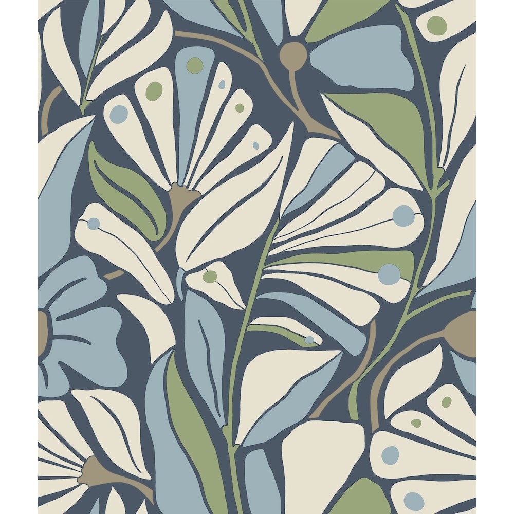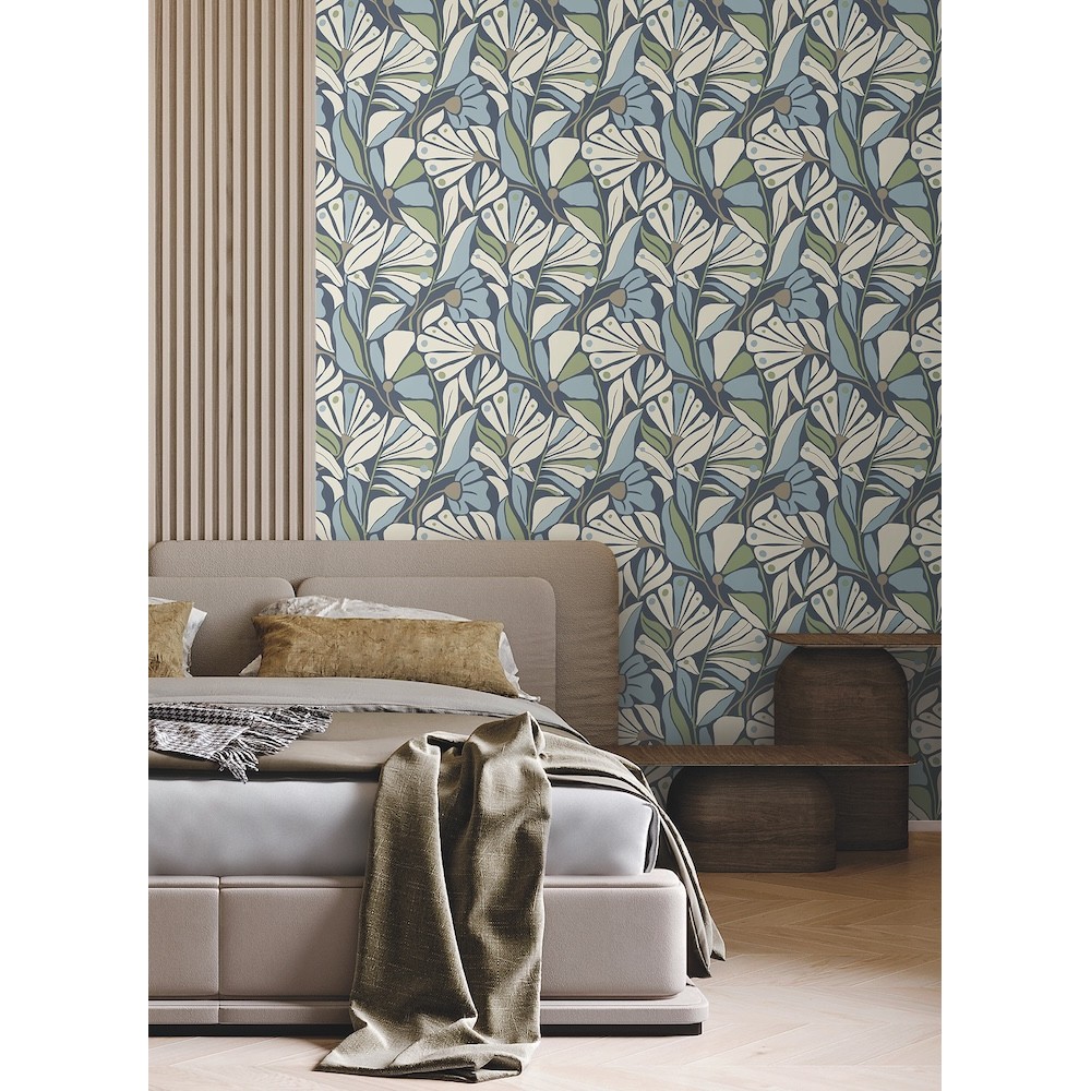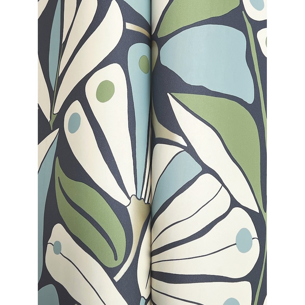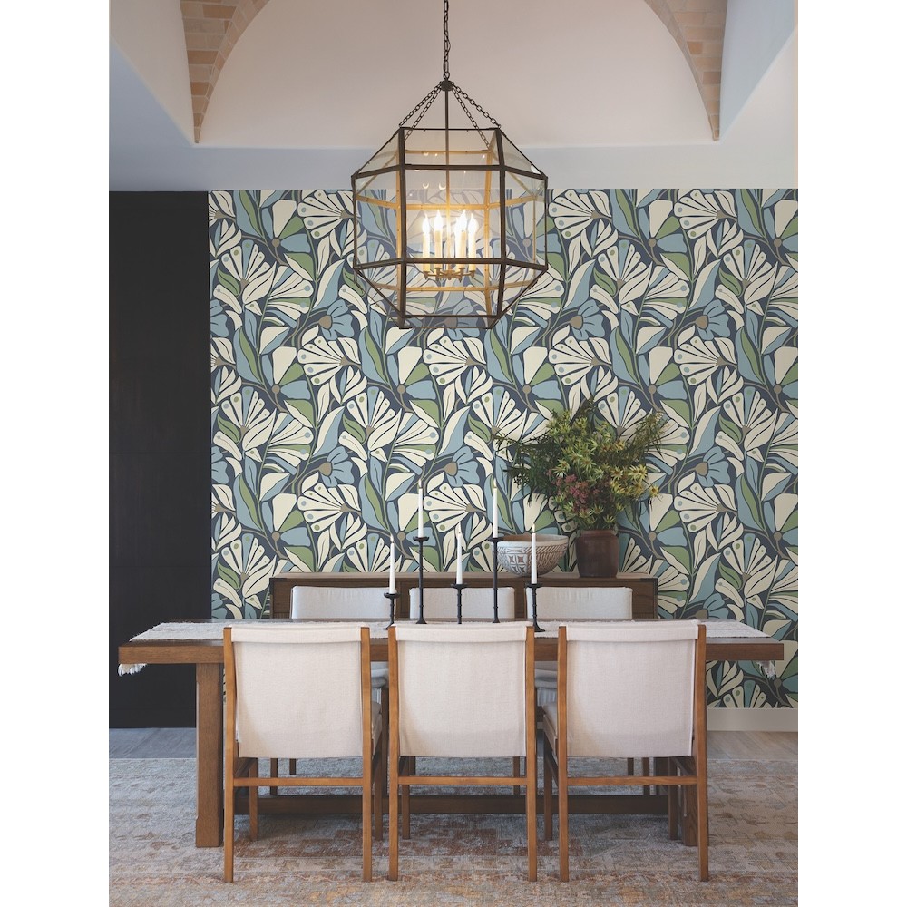 The epitome of bohemian elegance, Cabana Club's coastal fronds seem to drift in the breeze. Seen here in rich blues, green, and cream with metallic accents. This Cabana Club Wallpaper measures approximately 20.5 inches wide by 33 feet long, measuring approximately 56.4 square feet per roll.