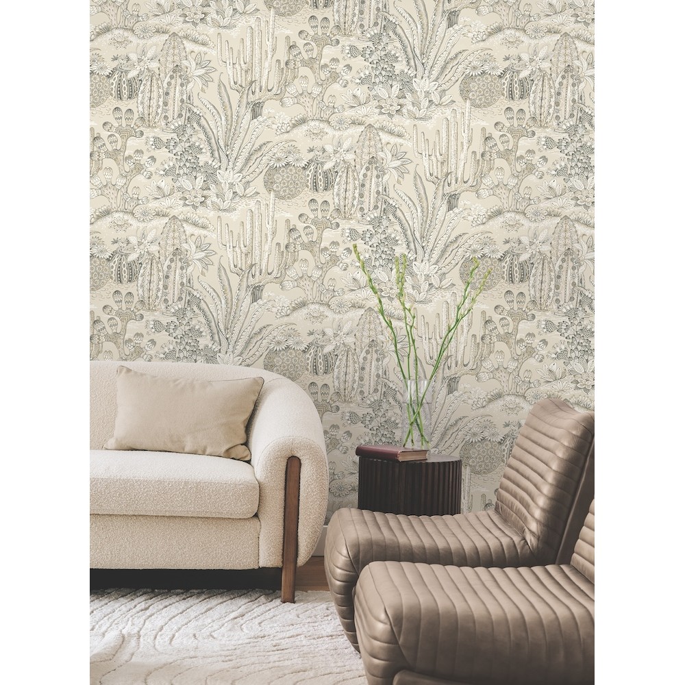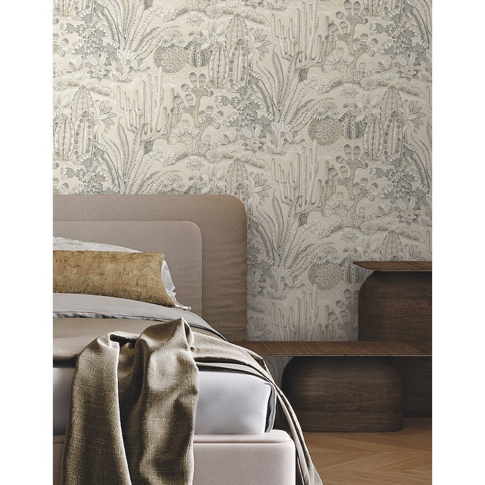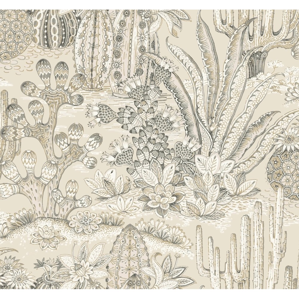 Lotus Land Cacti's richly patterned, desert-dwelling plants are an artistic representation of the beauty of arid climes. The design is inked in steel blue, charcoal, ochre, and white against sandy beige. This Lotus Land Cacti Wallpaper measures approximately 27 inches wide by 27 feet long, measuring approximately 60.8 square feet per roll.