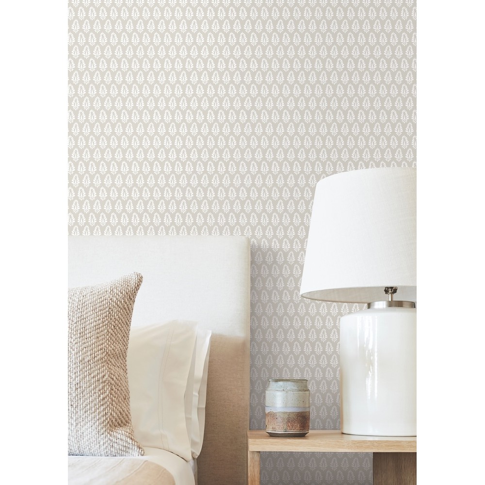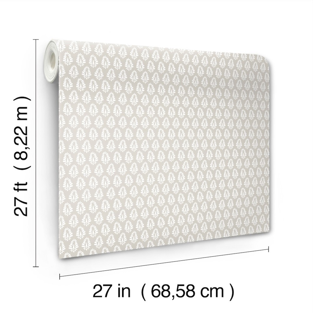 The dense patterning of Mehndi's petite botanical medallion adds sophistication to its simple design. Seen here in white on taupe. This Mehndi Wallpaper measures approximately 27 inches wide by 27 feet long, measuring approximately 60.8 square feet per roll.