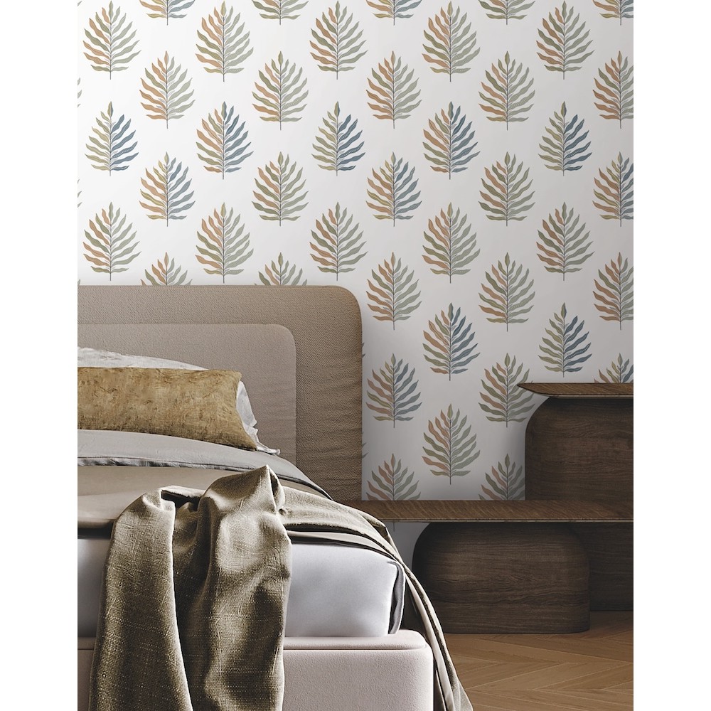Breezy palm leaves feature a chic, split palette in design Miramar. Seen here with rich ochre and terracotta paired against cool blue and sage. This Miramar Wallpaper measures approximately 27 inches wide by 27 feet long, measuring approximately 60.8 square feet per roll.