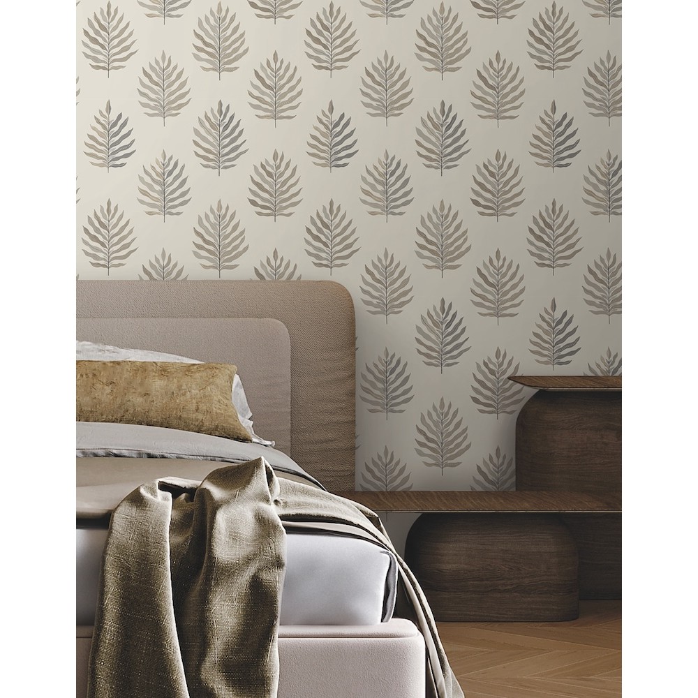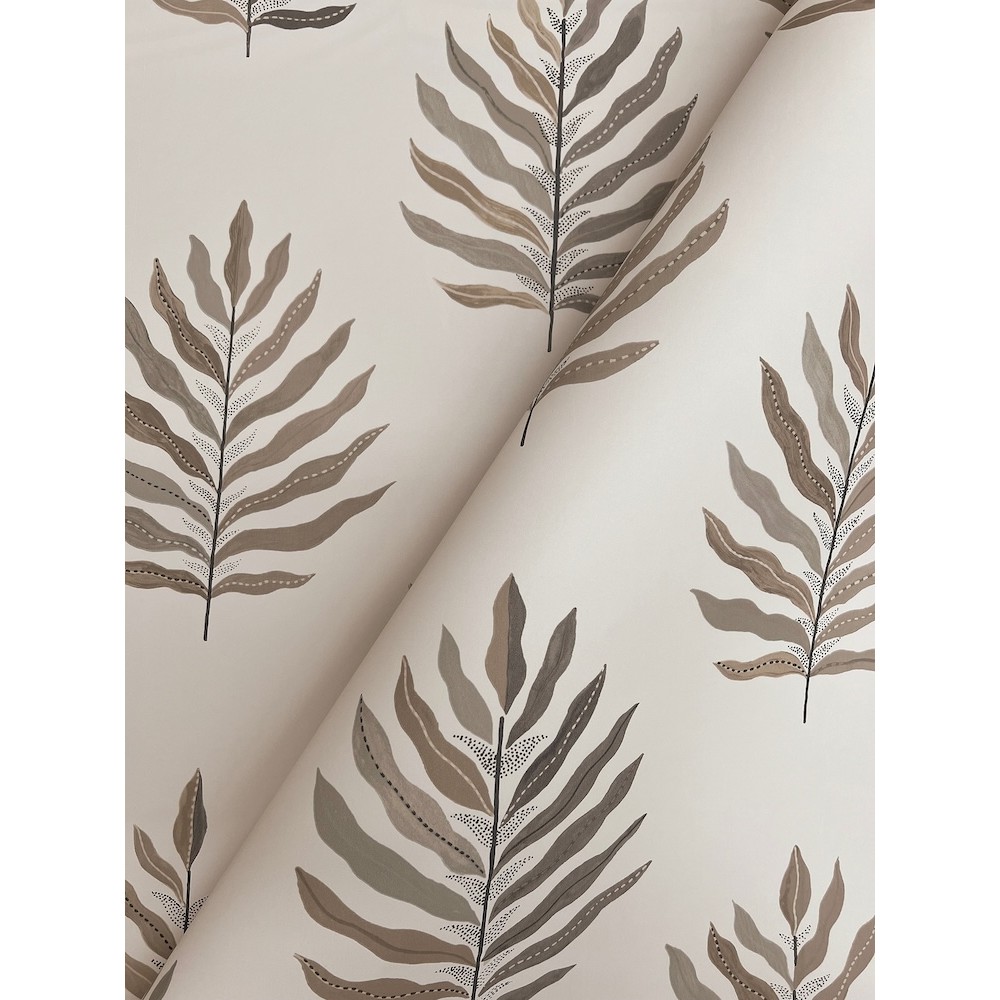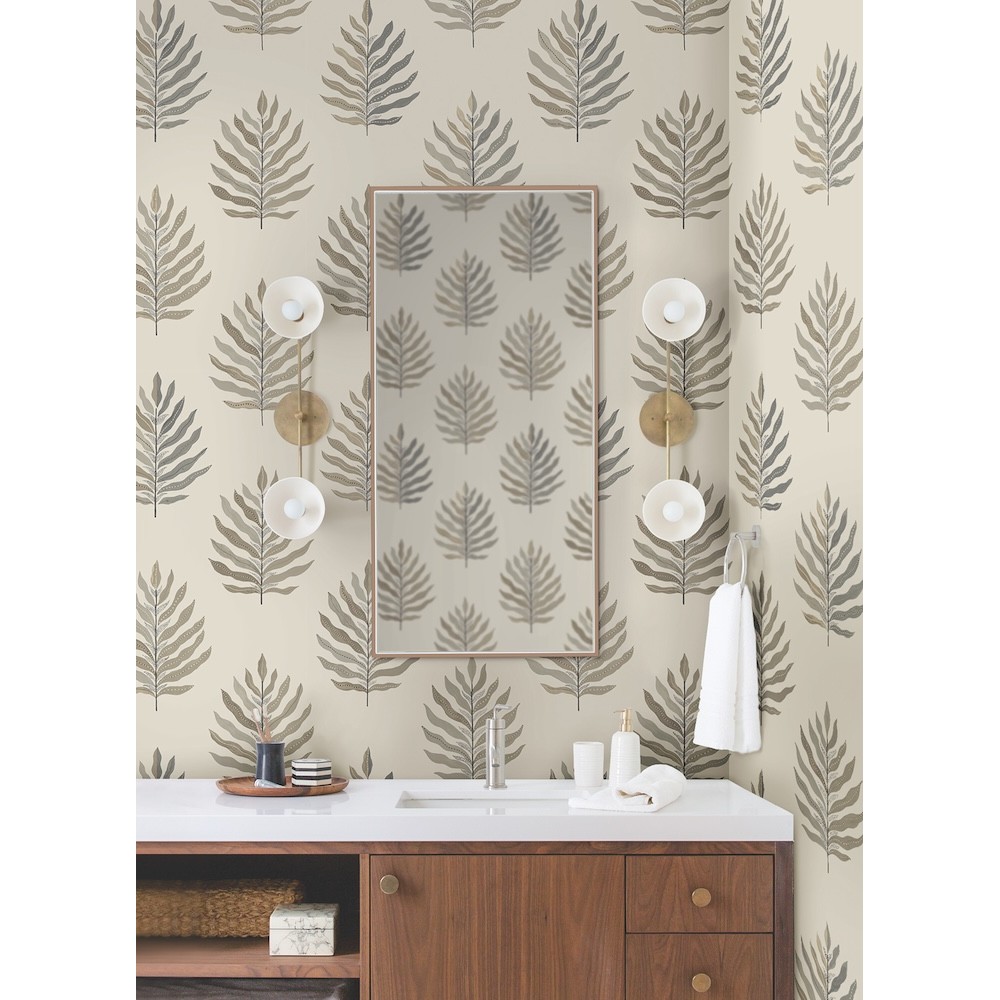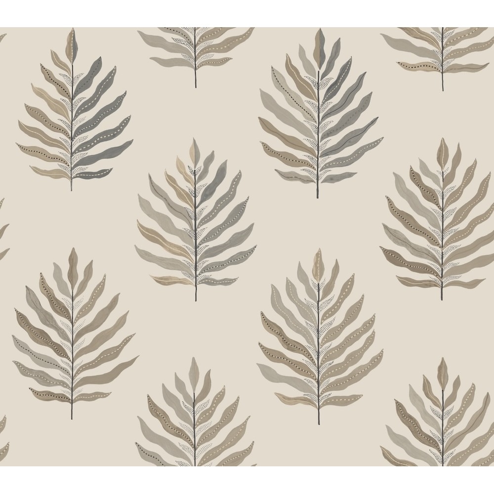 Breezy palm leaves feature a chic, split palette in design Miramar. Seen here with taupe and grey paired against charcoal. This Miramar Wallpaper measures approximately 27 inches wide by 27 feet long, measuring approximately 60.8 square feet per roll.