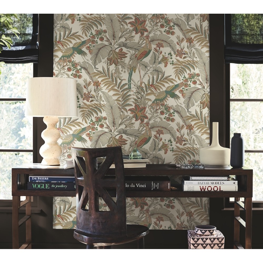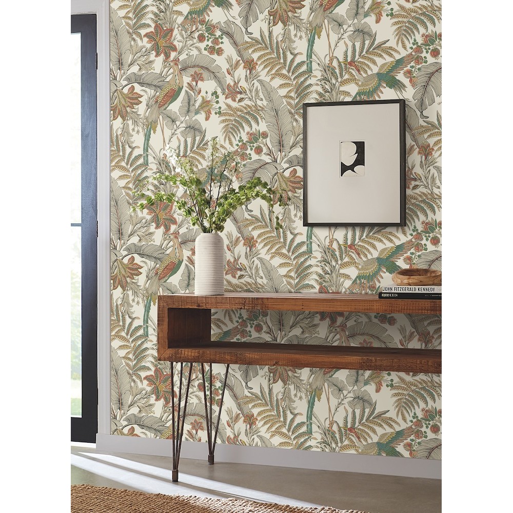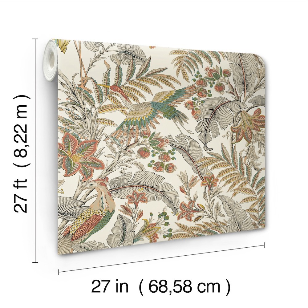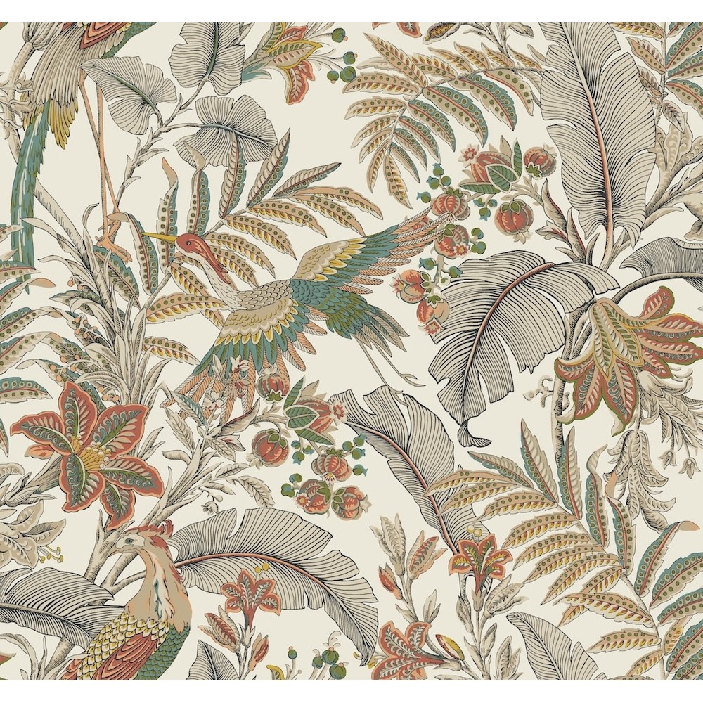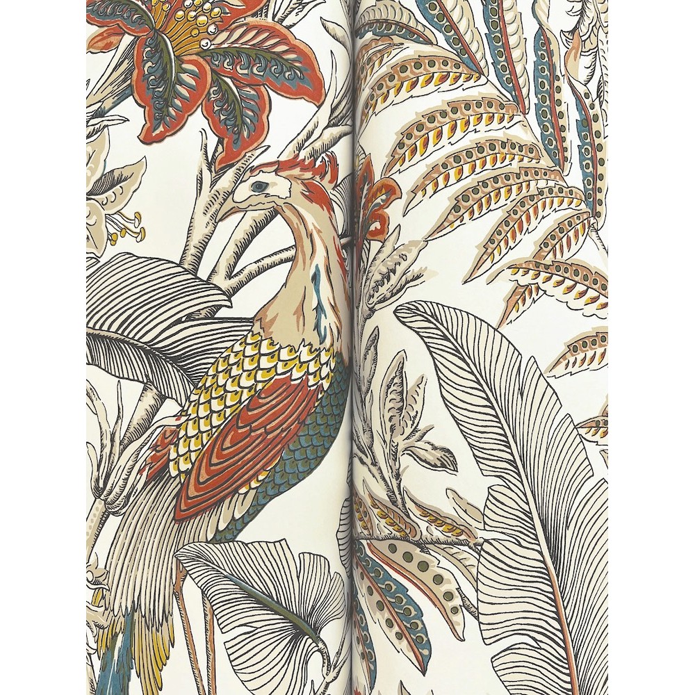 A lush array of richly illustrated flowers and fronds nearly hide the statuesque figures of these iconic wading birds in pattern Heronwood. Featured here in a palette of terracotta, persimmon, turquoise, moss, ochre, taupe, and alabaster. This Heronwood Wallpaper measures approximately 27 inches wide by 27 feet long, measuring approximately 60.8 square feet per roll.