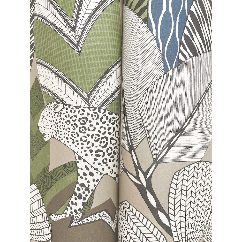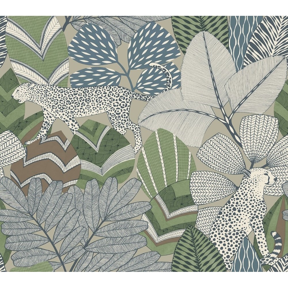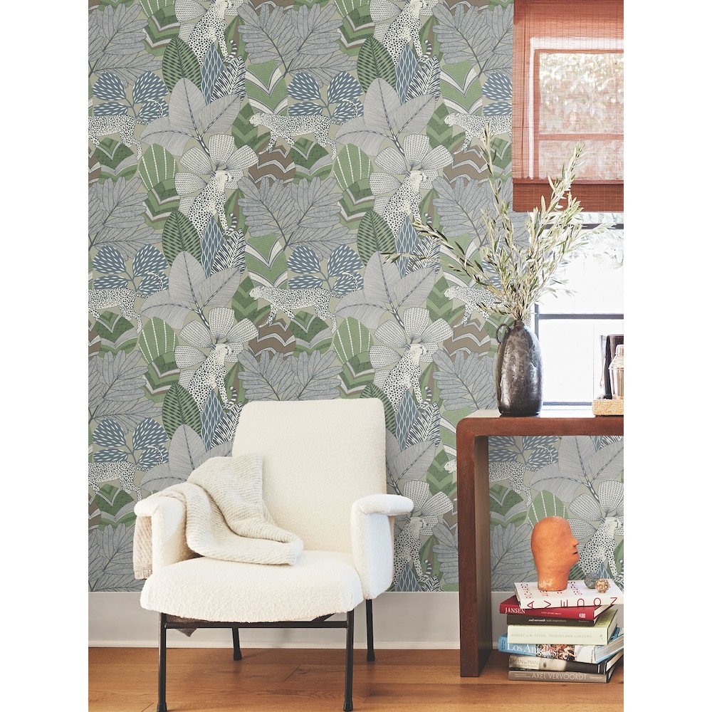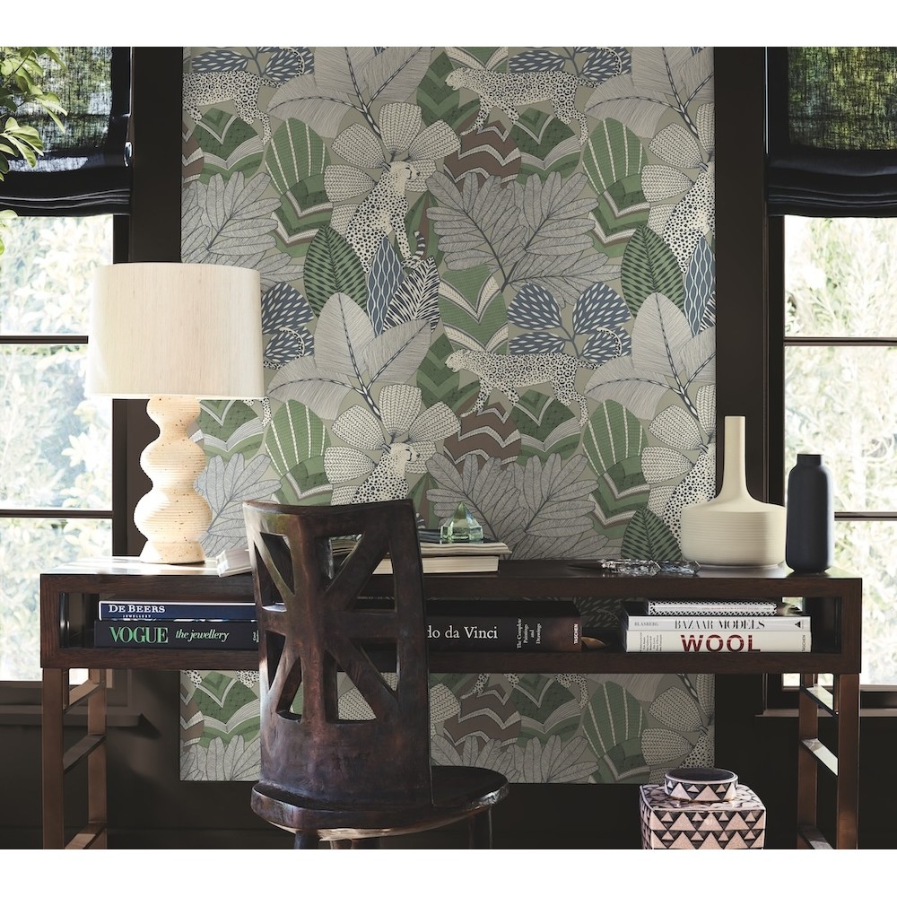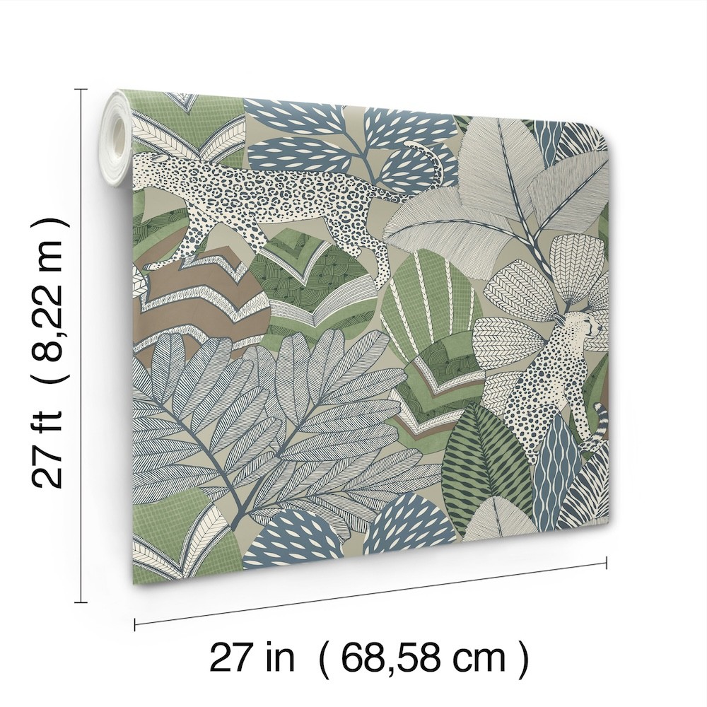 Wildcats prowl through dense, richly patterned foliage in fiercely sophisticated design Namiri. Featured here in a palette of green, indigo, espresso, cream, black, and beige. This Namiri Wallpaper measures approximately 27 inches wide by 27 feet long, measuring approximately 60.8 square feet per roll.