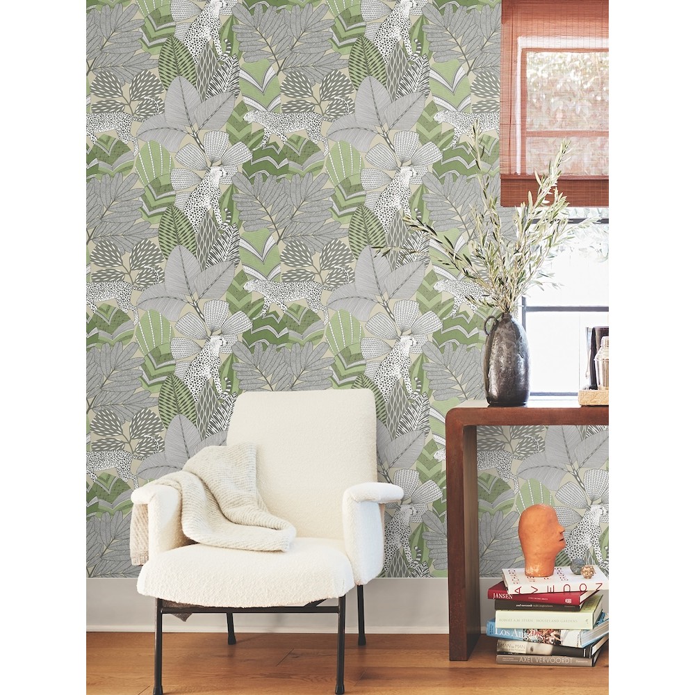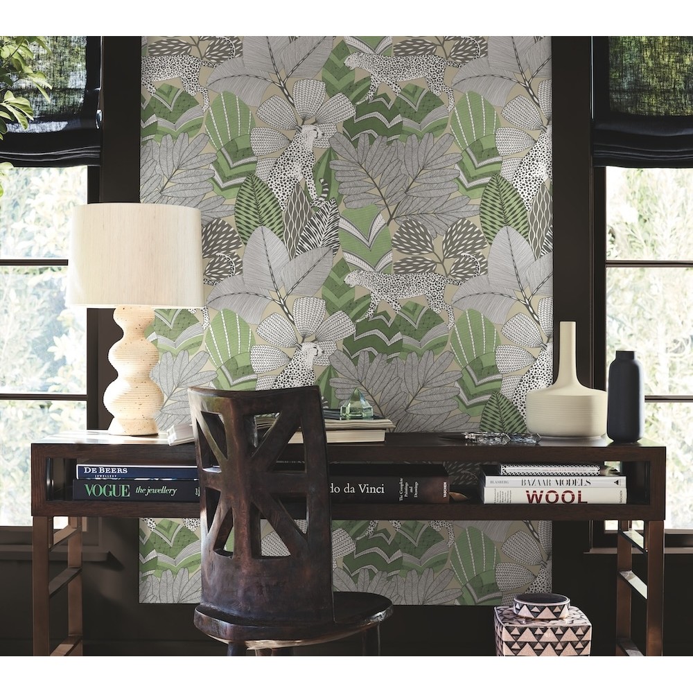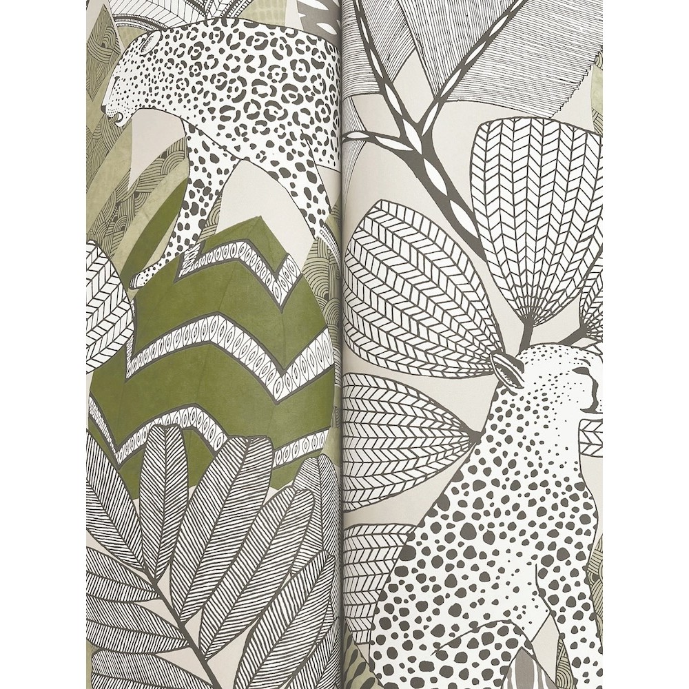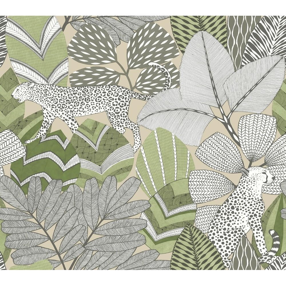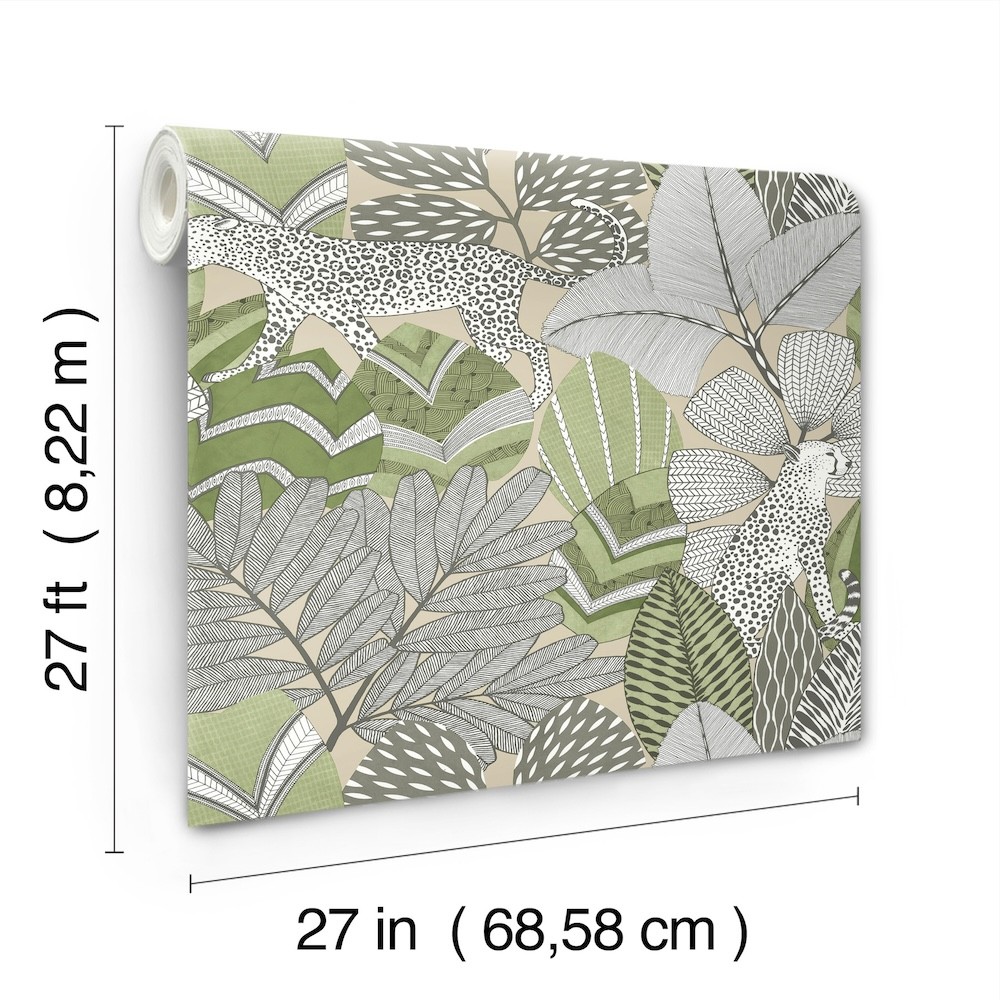Wildcats prowl through dense, richly patterned foliage in fiercely sophisticated design Namiri. Featured here in a palette of greens, grey, charcoal, white, and taupe. This Namiri Wallpaper measures approximately 27 inches wide by 27 feet long, measuring approximately 60.8 square feet per roll.