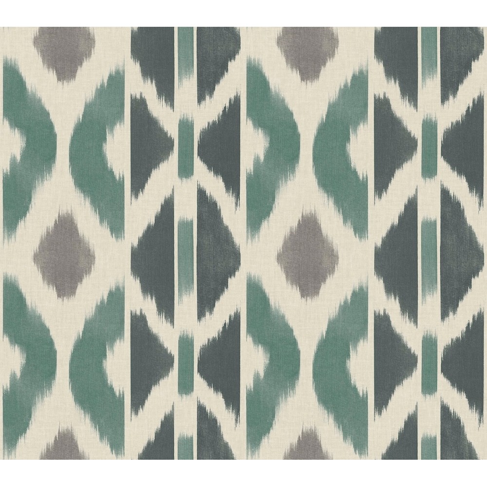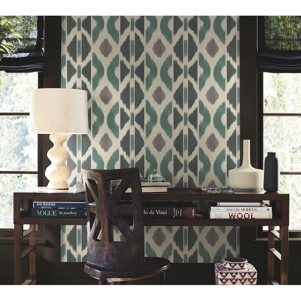 Patan showcases a multitude of ikat design applications, with alternating stripes embellished with complementary diamond motifs. Seen here in a palette of rich indigo, teal, storm grey, and beige. This Patan Wallpaper measures approximately 27 inches wide by 27 feet long, measuring approximately 60.8 square feet per roll.