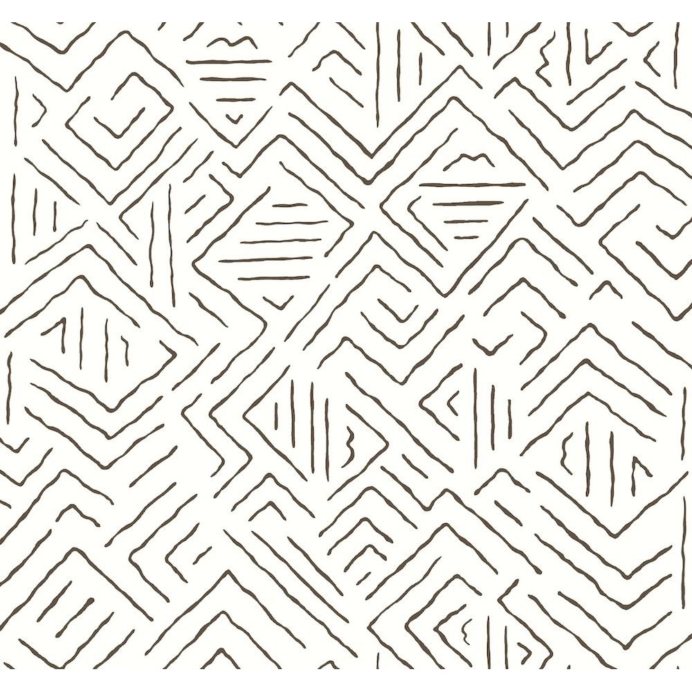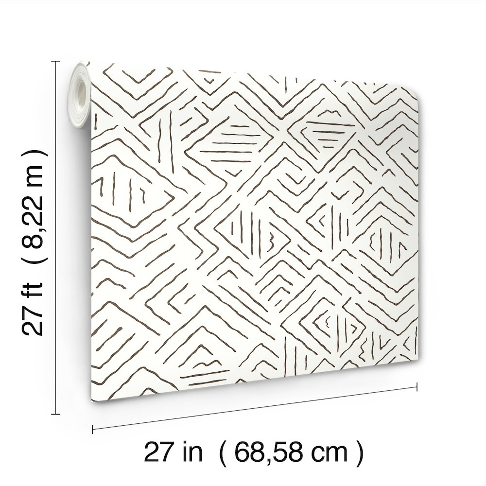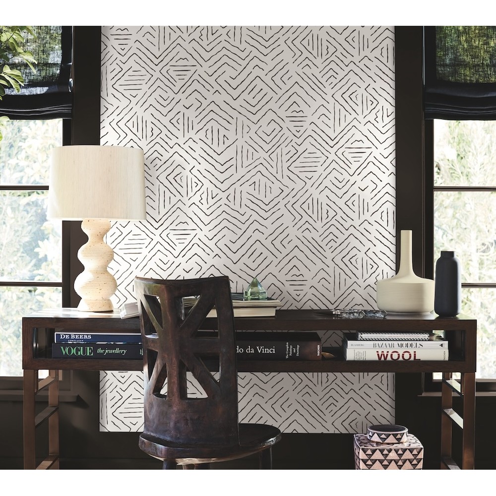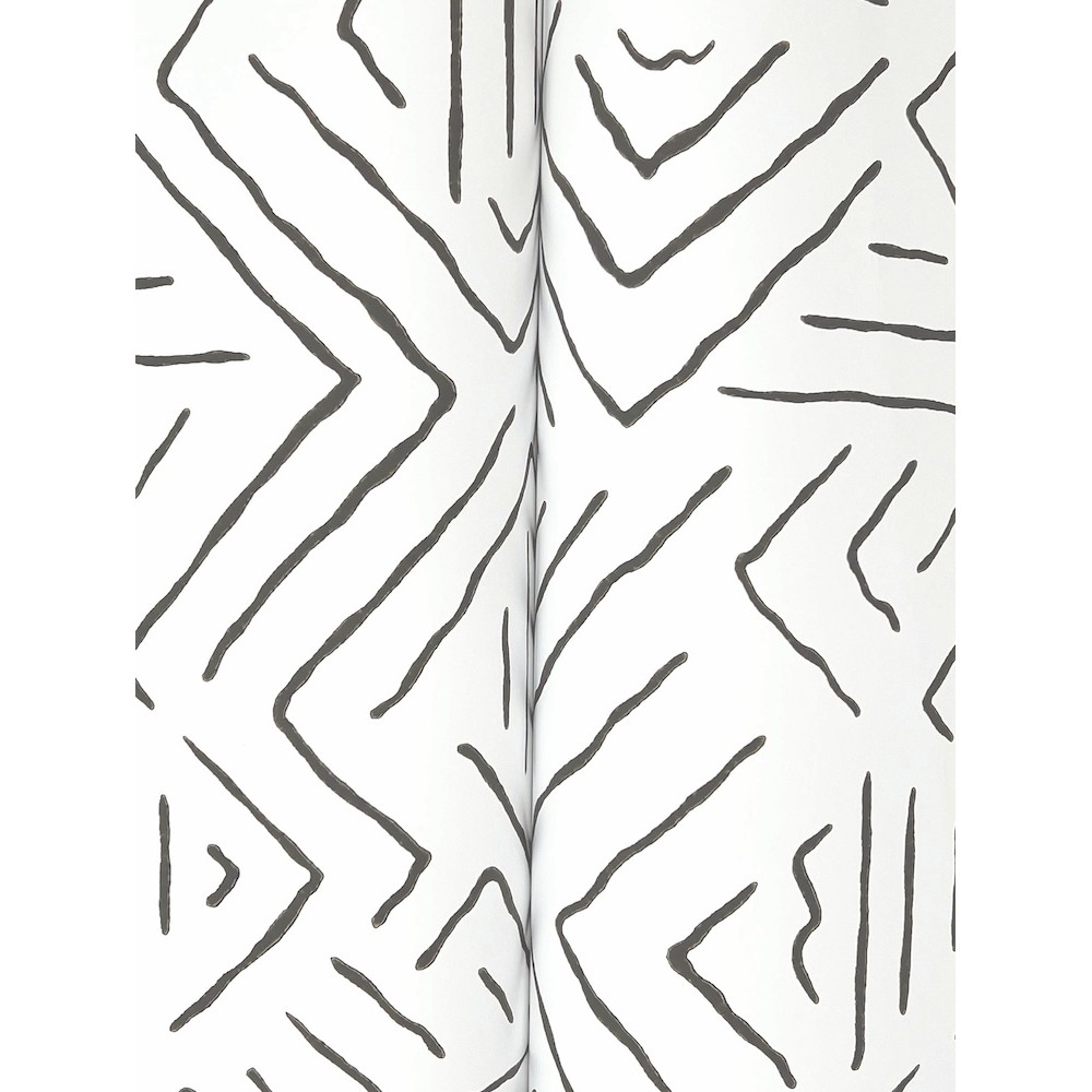 Tribal geometrics are streamlined to their simplest, hand-drawn forms in pattern Sirih. Seen here with black linework against white. This Sirih Wallpaper measures approximately 27 inches wide by 27 feet long, measuring approximately 60.8 square feet per roll.
