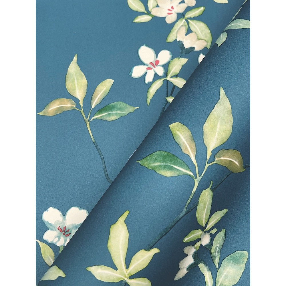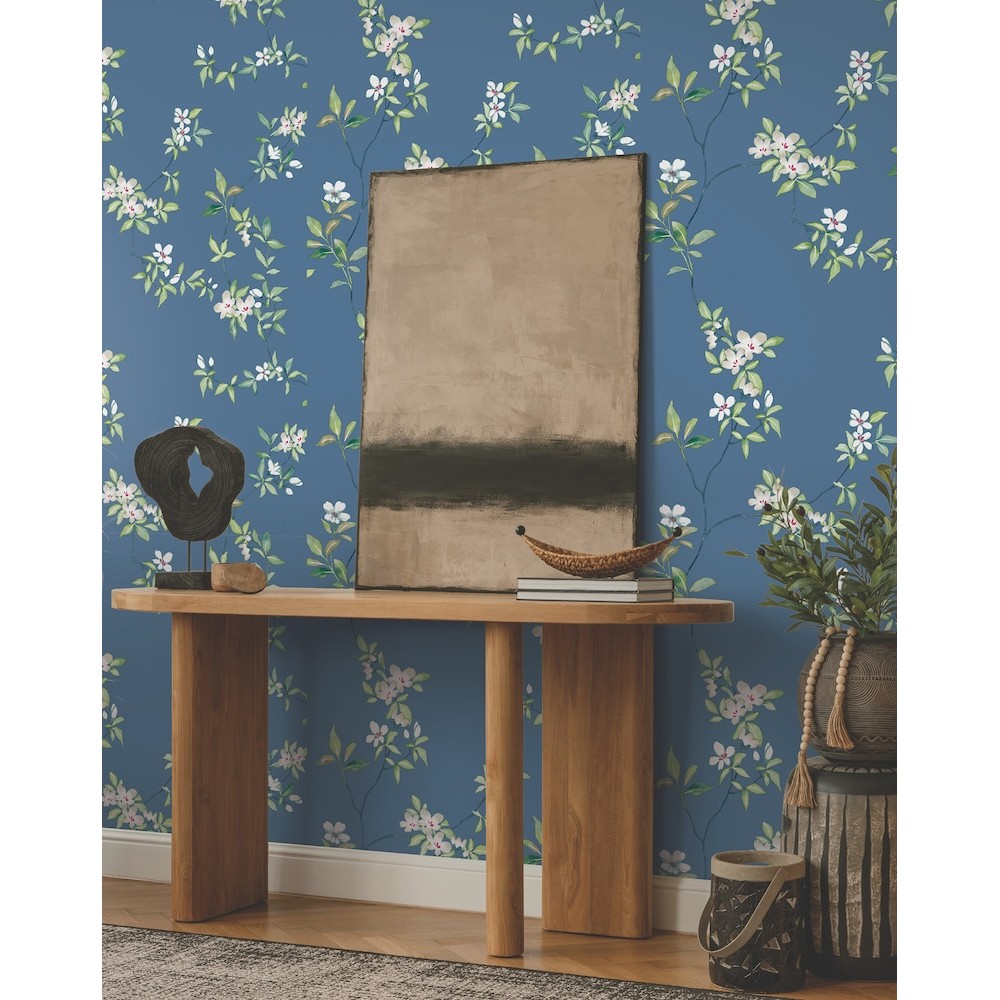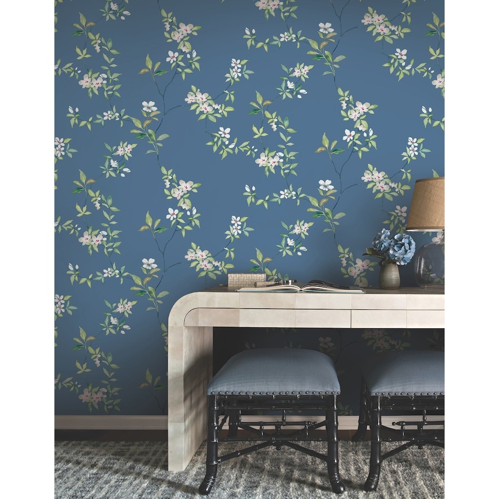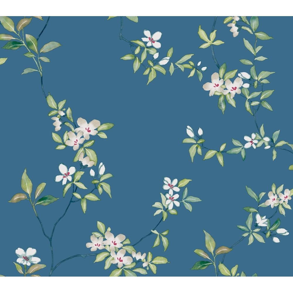 Tender watercolor buds, colorful blooms, and new leaves cling to April Blossom branches, afloat in a sea of classic color in this stylized floral motif, shown here in gentle white and green on cobalt. This April Blossom Wallpaper measures approximately 27 inches wide by 27 feet long, measuring approximately 60.8 square feet per roll.