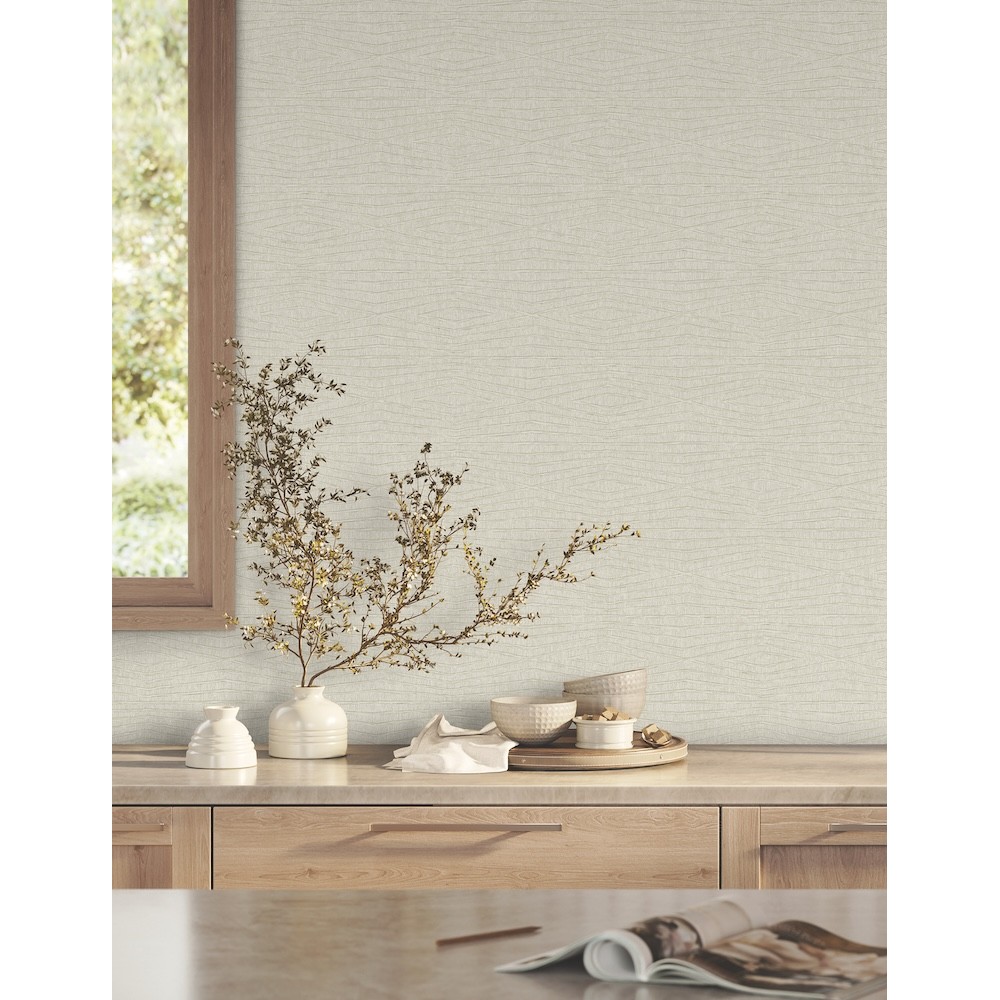 Raised lines flow and flex with horizontal dimension in Daystone's abstract geometric that mixes modern symmetry with hand-drawn artistry, shown here in taupe with raised relief. This Daystone Wallpaper measures approximately 27 inches wide by 27 feet long, measuring approximately 60.8 square feet per roll.