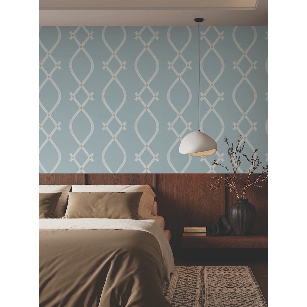 The geometric pattern Elena’s suggestion of enlarged looped ribbons creates this raised, overlapping diamond and striped ogee effect, shown here in sky blue and pearl with gold metallic. This Ellena Wallpaper measures approximately 27 inches wide by 27 feet long, measuring approximately 60.8 square feet per roll.
