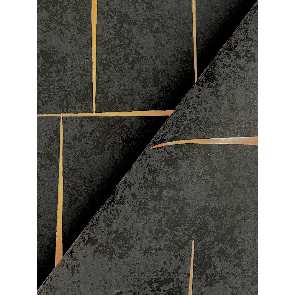 Malia wallpaper's hand-drawn irregular rectangles define a floating hatchwork effect with rugged energy and modern panache, shown here in black with gold metallic. This Malia Wallpaper measures approximately 27 inches wide by 27 feet long, measuring approximately 60.8 square feet per roll.