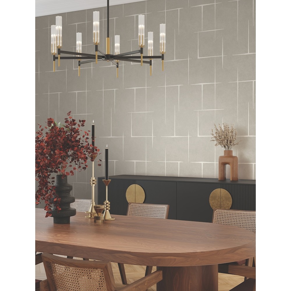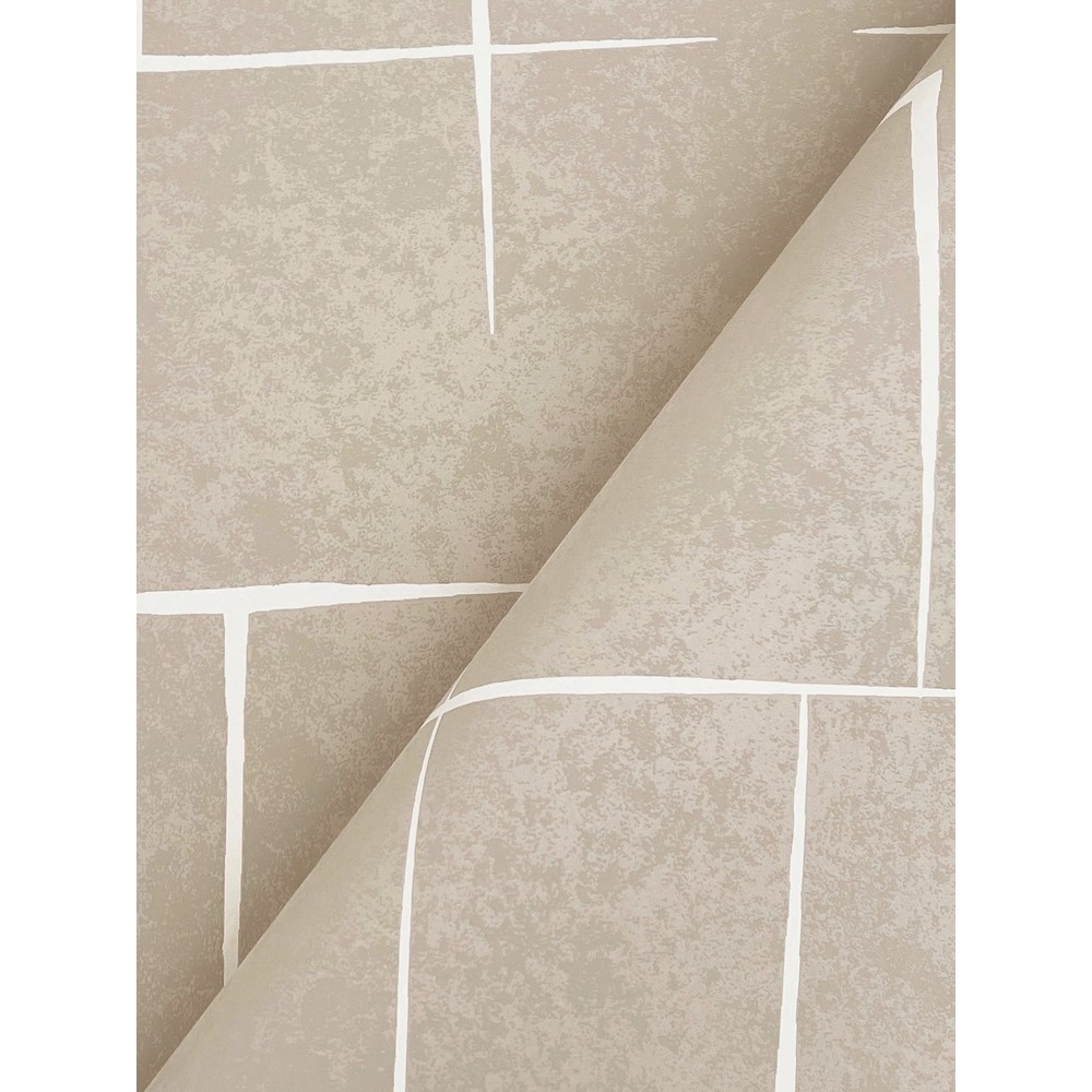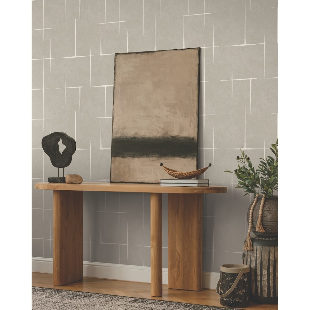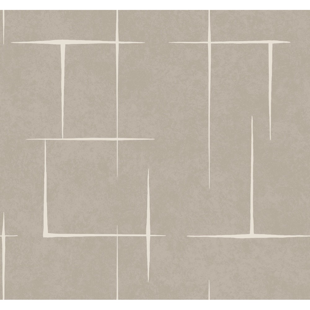 Maia wallpaper's hand-drawn irregular rectangles define a floating hatchwork effect with rugged energy and modern panache, shown here in taupe with off white. This Malia Wallpaper measures approximately 27 inches wide by 27 feet long, measuring approximately 60.8 square feet per roll.