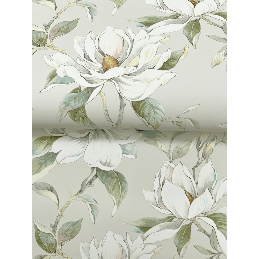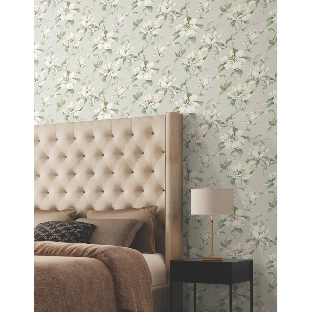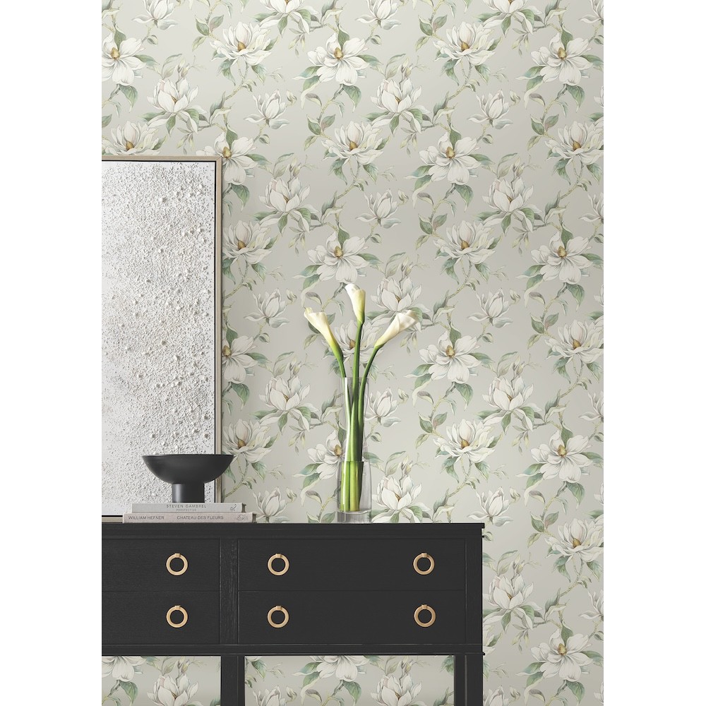 Floating Magnolia blossoms sway among delicate stems and leaves in the formal botanical Garden Jewels, featured in warm gray, green, and white. This Garden Jewels Wallpaper measures approximately 27 inches wide by 27 feet long, measuring approximately 60.8 square feet per roll. Candice Olson’s signature aesthetic defines timeless modern style. Decadence Second Edition features a gallery of glamorous specialty and luminous metallics dedicated to luxury living.