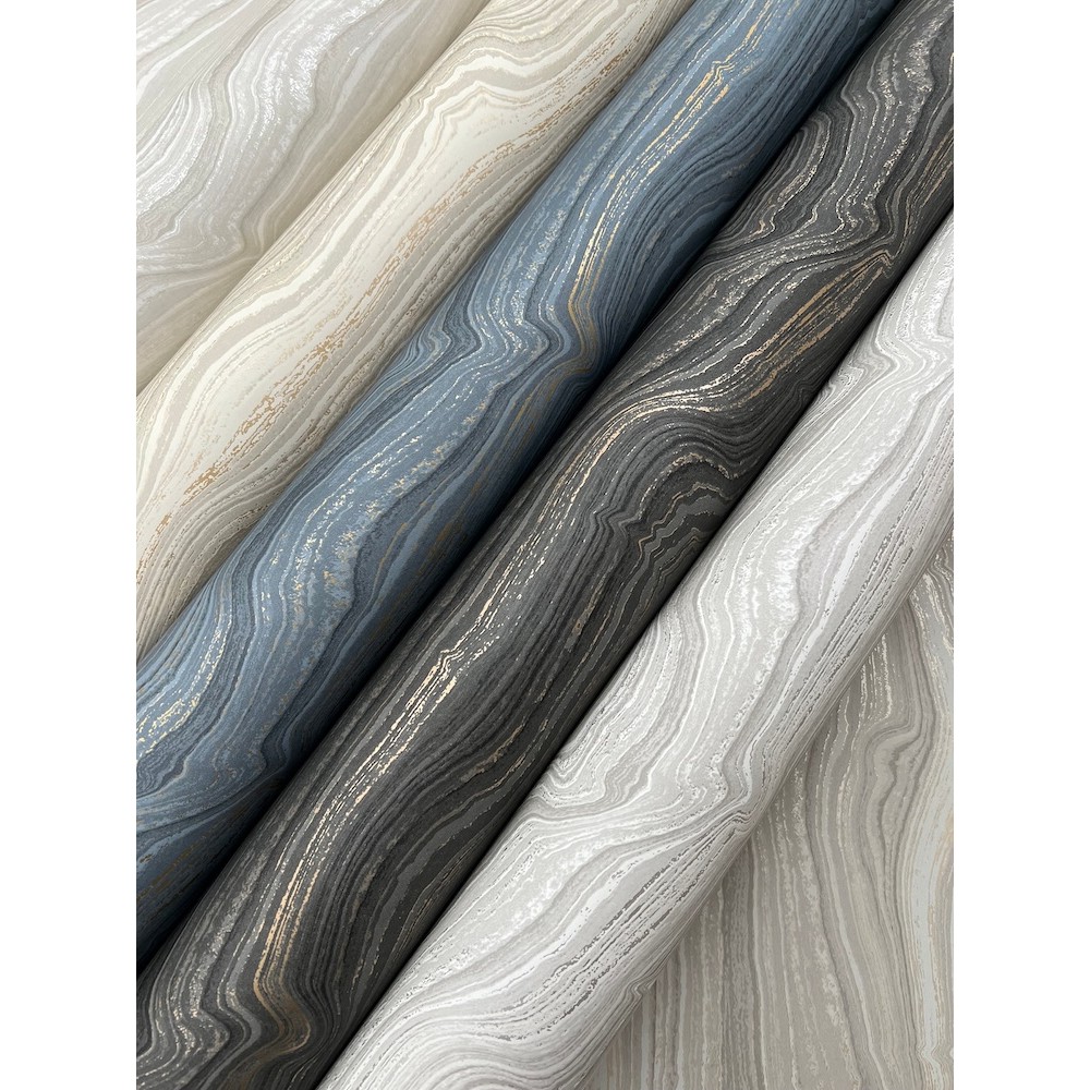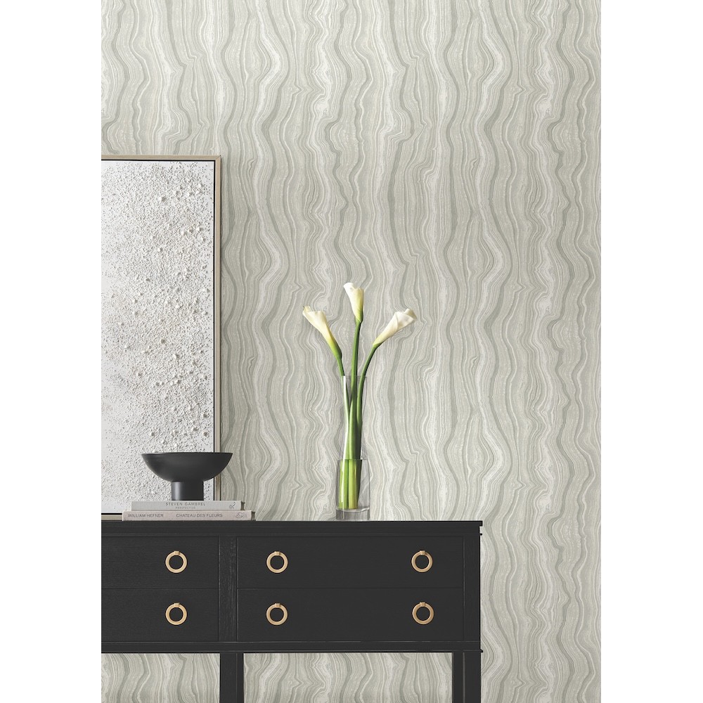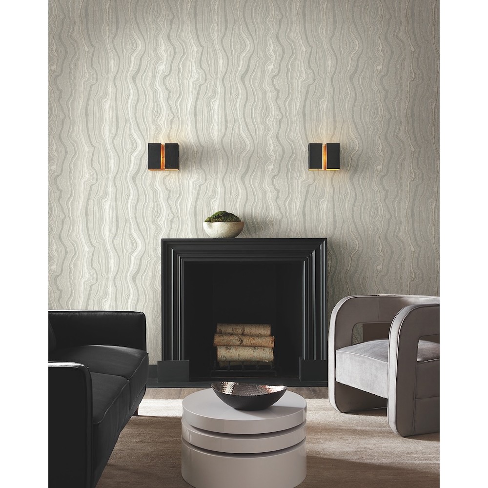 Stratified layers reminiscent of gemstone formations showcase vertical lines threaded with a lustrous mineral shimmer in this earthy, contemporary geometric, featured in gray and pearl. This Mineral Shimmer Wallpaper measures approximately 27 inches wide by 27 feet long, measuring approximately 60.8 square feet per roll.
