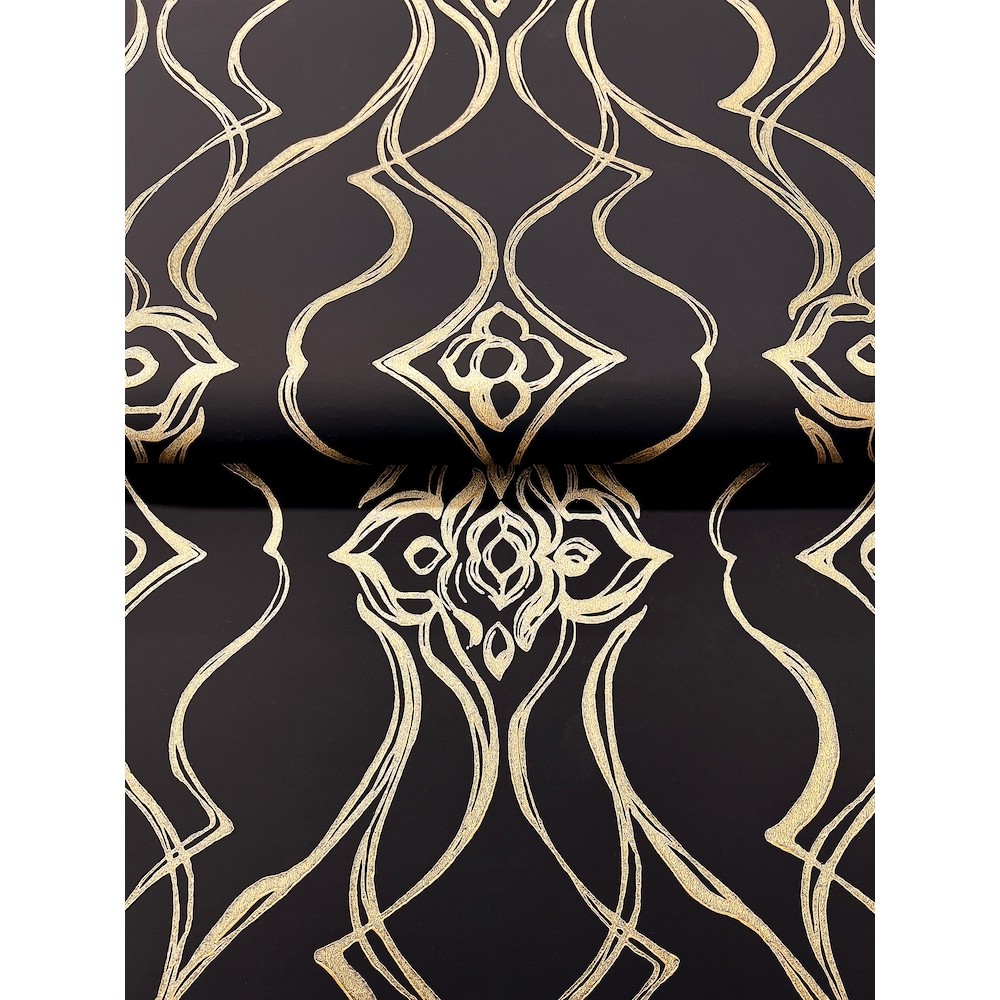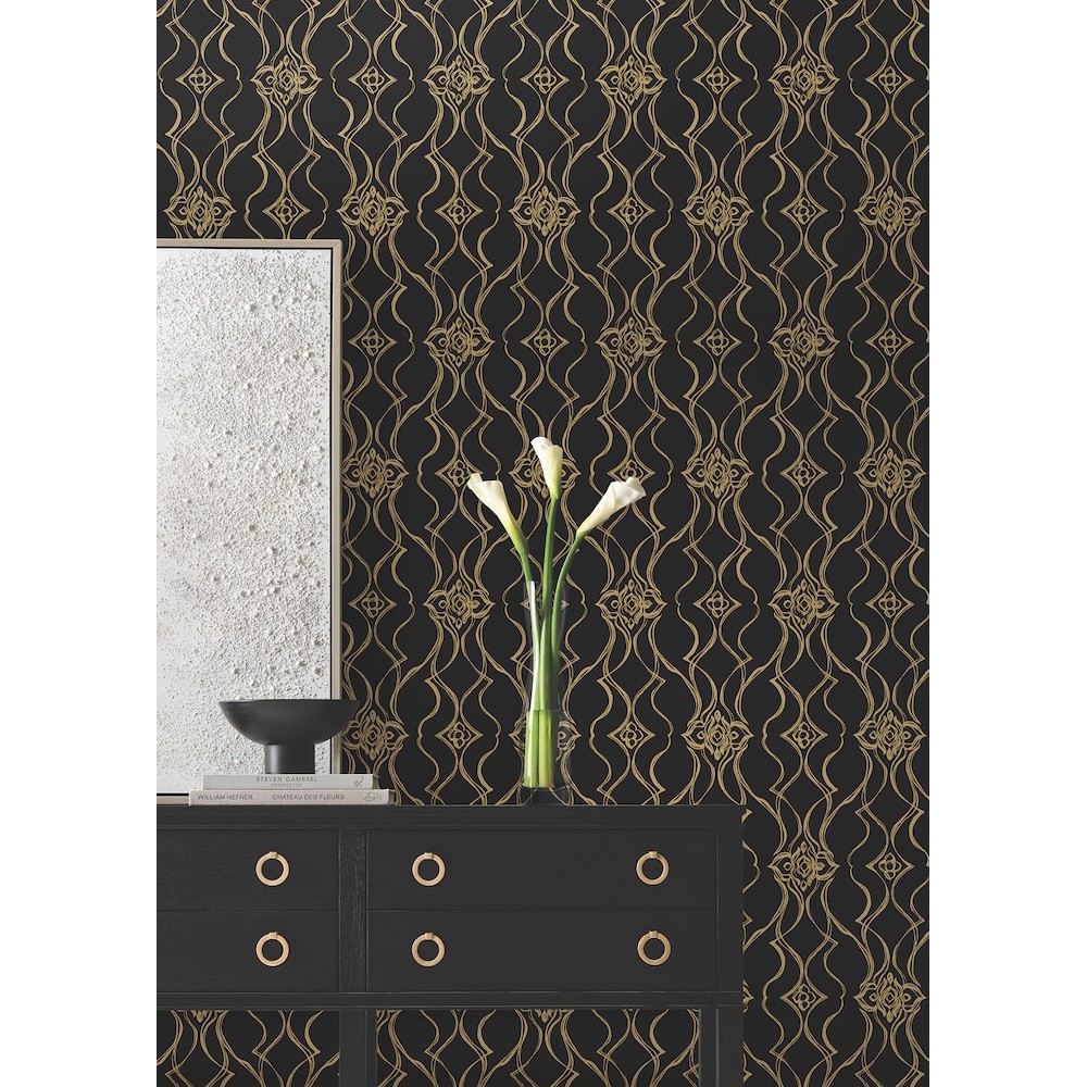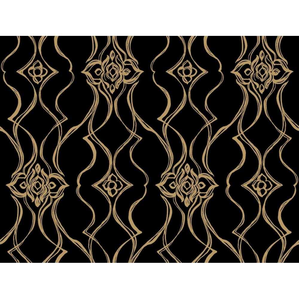 The stylized sketched damask Pirouette dances and spins a classic design into contemporary artistic motion with a glamourous touch of sparkling metallic, featured here with black and gold. This Pirouette Wallpaper measures approximately 27 inches wide by 27 feet long, measuring approximately 60.8 square feet per roll.